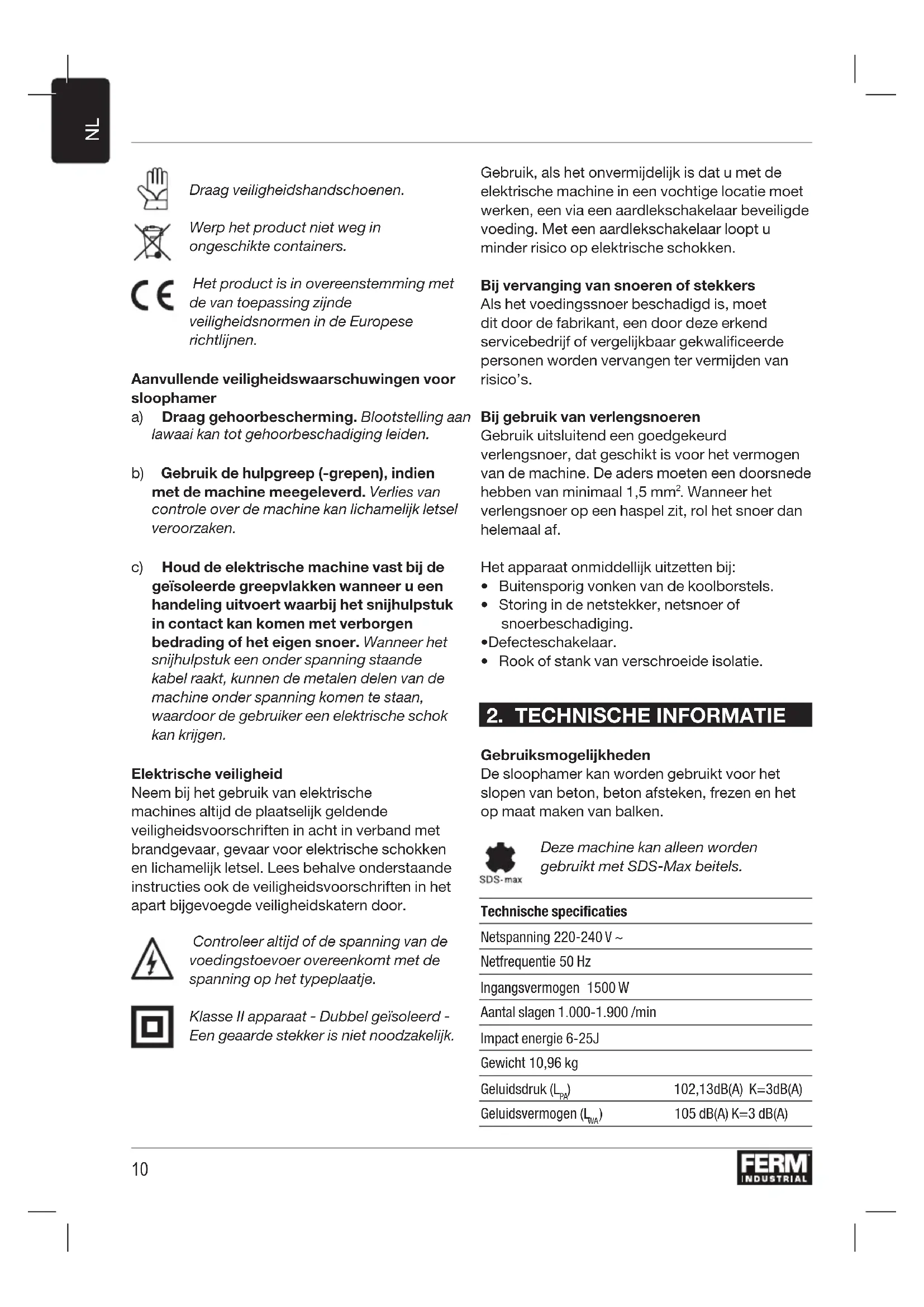 Gebruiksmogelijkheden De sloophamer kan worden gebruikt voor het slopen van beton, beton afsteken, frezen en het op maat maken van balken. Deze machine kan alleen worden gebruikt met SDS-Max beitels. Technische specificaties Netspanning 220-240 V ~ Netfrequentie 50 Hz Ingangsvermogen 1500 W Aantal slagen 1.000-1.900 /min Impact energie 6-25J Gewicht 10,96 kg Geluidsdruk (L
