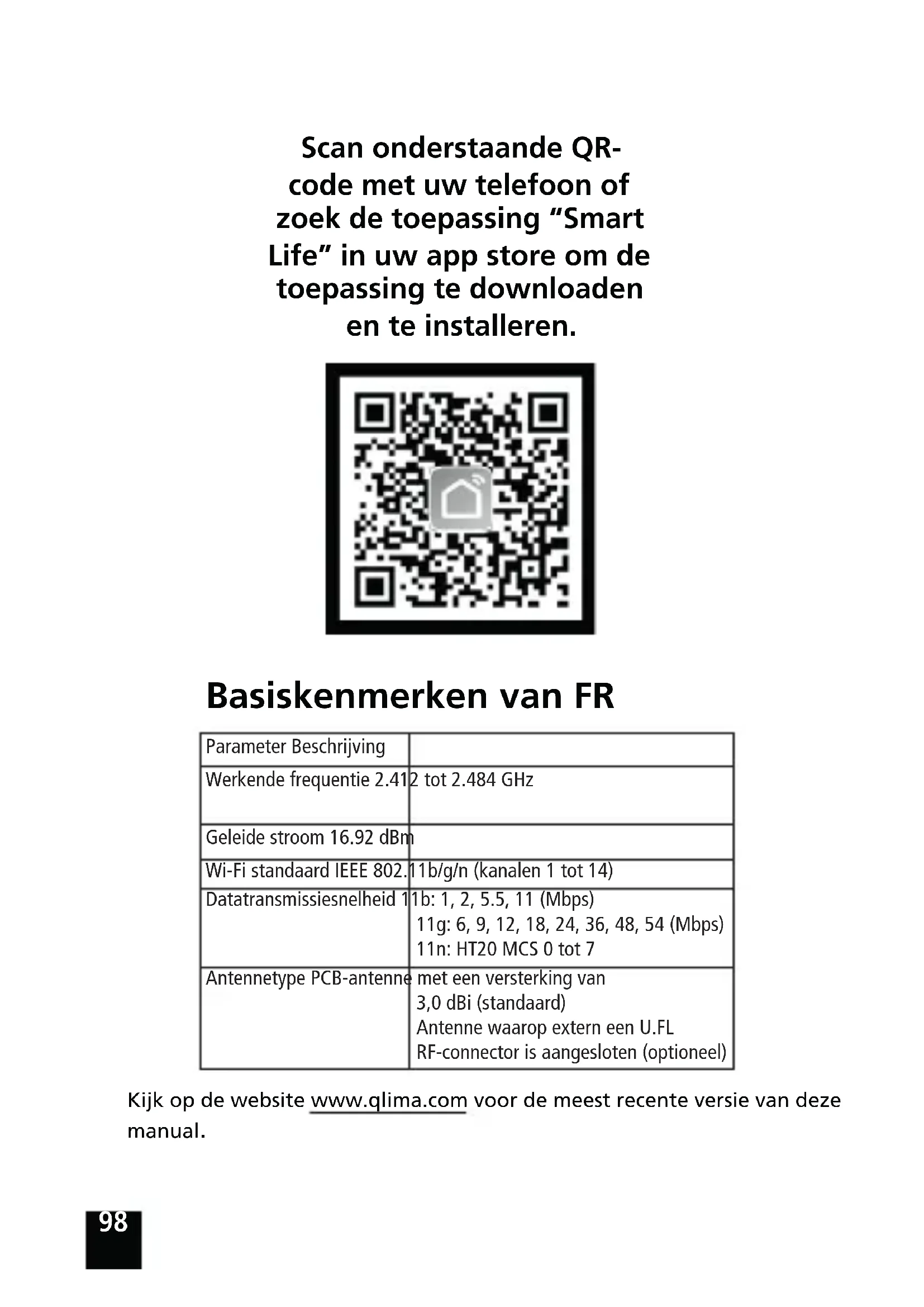 il numero e l’interfaccia dell’app in questo manuale sono solo per esempio. Nessuna notifica aggiuntiva su ulteriori modifiche.9798 Scan onderstaande QR- code met uw telefoon of zoek de toepassing “Smart Life” in uw app store om de toepassing te downloaden en te installeren. Basiskenmerken van FR Kijk op de website www.qlima.com voor de meest recente versie van deze manual. Parameter Beschrijving Werkende frequentie 2.412 tot 2.484 GHz Geleide stroom 16.92 dBm Wi-Fi standaard IEEE 802.11b/g/n (kanalen 1 tot 14) Datatransmissiesnelheid 11b: 1, 2, 5.5, 11 (Mbps) 11g: 6, 9, 12, 18, 24, 36, 48, 54 (Mbps) 11n: HT20 MCS 0 tot 7 Antennetype PCB-antenne met een versterking van 3,0 dBi (standaard) Antenne waarop extern een U.FL RF-connector is aangesloten (optioneel)99