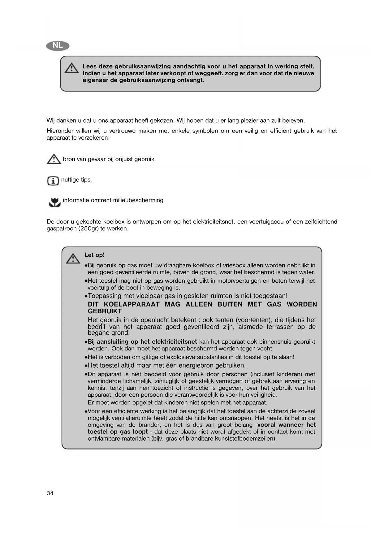 Wij danken u dat u ons apparaat heeft gekozen. Wij hopen dat u er lang plezier aan zult beleven. Hieronder willen wij u vertrouwd maken met enkele symbolen om een veilig en efficiënt gebruik van het apparaat te verzekeren: bron van gevaar bij onjuist gebruik nuttige tips informatie omtrent milieubescherming De door u gekochte koelbox is ontworpen om op het elektriciteitsnet, een voertuigaccu of een zelfdichtend gaspatroon (250gr) te werken. Let op! Bij gebruik op gas moet uw draagbare koelbox of vriesbox alleen worden gebruikt in een goed geventileerde ruimte, boven de grond, waar het beschermd is tegen water. Het toestel mag niet op gas worden gebruikt in motorvoertuigen en boten terwijl het voertuig of de boot in beweging is. Toepassing met vloeibaar gas in gesloten ruimten is niet toegestaan! DIT KOELAPPARAAT MAG ALLEEN BUITEN MET GAS WORDEN GEBRUIKT Het gebruik in de openlucht betekent : ook tenten (voortenten), die tijdens het bedrijf van het apparaat goed geventileerd zijn, alsmede terrassen op de begane grond. Bij aansluiting op het elektriciteitsnet kan het apparaat ook binnenshuis gebruikt worden. Ook dan moet het apparaat beschermd worden tegen vocht. Het is verboden om giftige of explosieve substanties in dit toestel op te slaan! Het toestel altijd maar met één energiebron gebruiken. Dit apparaat is niet bedoeld voor gebruik door personen (inclusief kinderen) met verminderde lichamelijk, zintuiglijk of geestelijk vermogen of gebrek aan ervaring en kennis, tenzij aan hen toezicht of instructie is gegeven, over het gebruik van het apparaat, door een persoon die verantwoordelijk is voor hun veiligheid. Er moet worden opgelet dat kinderen niet spelen met het apparaat. Voor een efficiënte werking is het belangrijk dat het toestel aan de achterzijde zoveel mogelijk ventilatieruimte heeft zodat de hitte kan ontsnappen. Het heetst is het in de omgeving van de brander, en het is dus van groot belang -vooral wanneer het toestel op gas loopt - dat deze plaats niet wordt afgedekt of in contact komt met ontvlambare materialen (bijv. gras of brandbare kunststofbodemzeilen). Lees deze gebruiksaanwijzing aandachtig voor u het apparaat in werking stelt. Indien u het apparaat later verkoopt of weggeeft, zorg er dan voor dat de nieuwe eigenaar de gebruiksaanwijzing ontvangt.35 INHOUD INHOUD