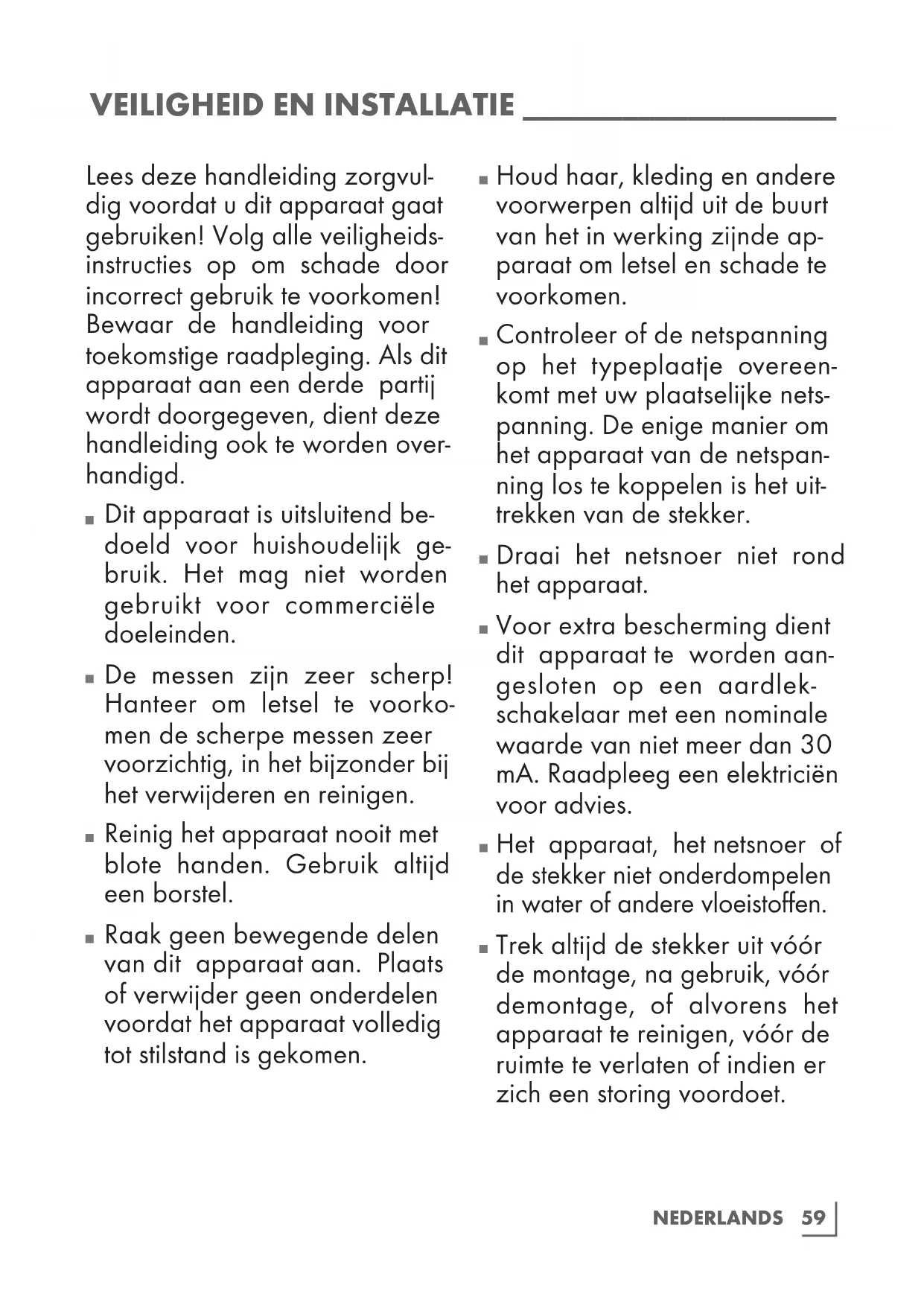 De messen zijn zeer scherp! Hanteer om letsel te voorko- men de scherpe messen zeer voorzichtig, in het bijzonder bij het verwijderen en reinigen.
