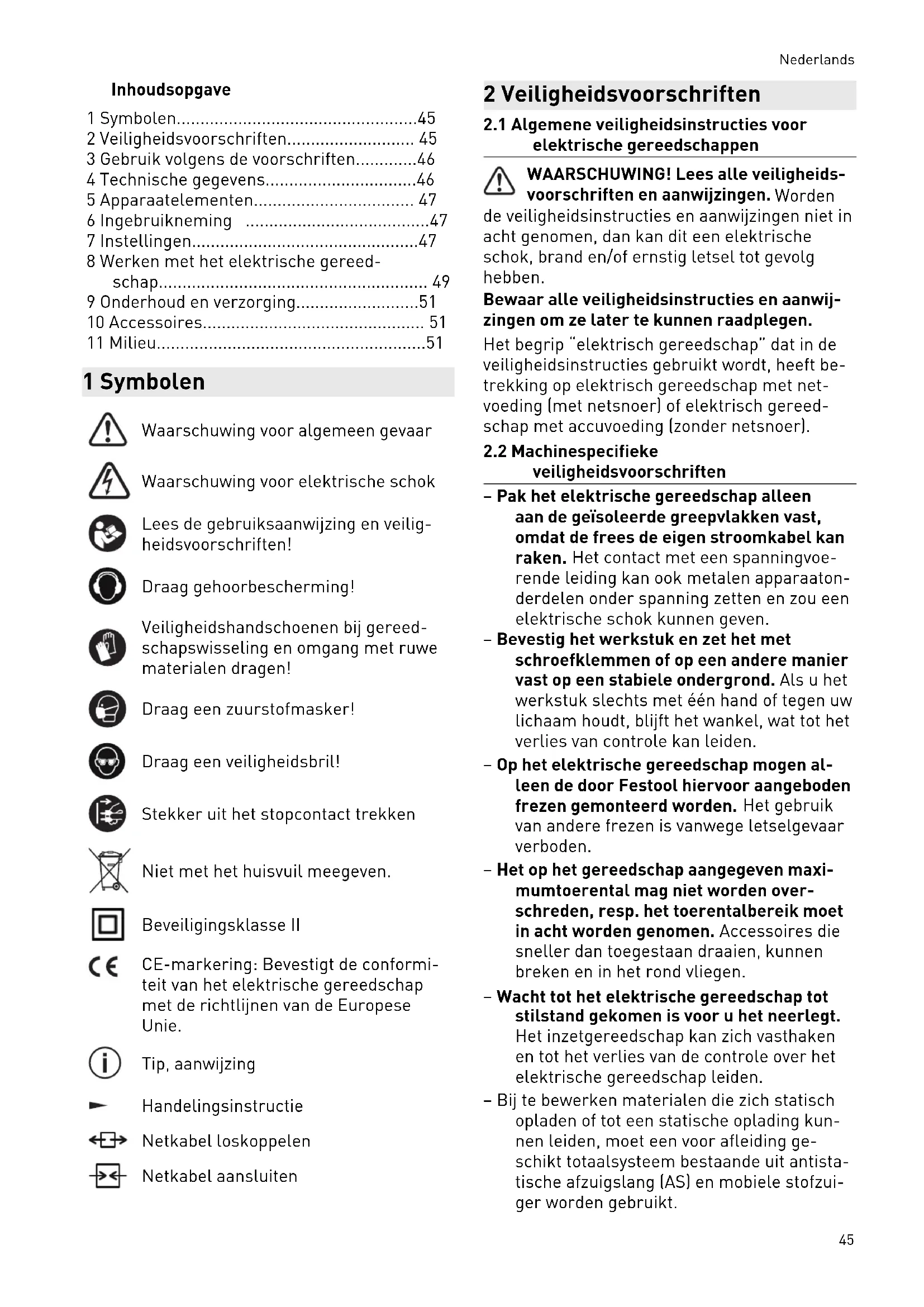 - 11 Milieu 1 Symbolen Waarschuwing voor algemeen gevaar Waarschuwing voor elektrische schok Lees de gebruiksaanwijzing en veilig heidsvoorschriften! Draag gehoorbescherming! Veiligheidshandschoenen bij gereed schapswisseling en omgang met ruwe materialen dragen! Draag een zuurstofmasker! Draag een veiligheidsbril! Stekker uit het stopcontact trekken Niet met het huisvuil meegeven. Beveiligingsklasse II CE-markering: Bevestigt de conformi teit van het elektrische gereedschap met de richtlijnen van de Europese Unie. Tip, aanwijzing Handelingsinstructie Netkabel loskoppelen Netkabel aansluiten 2 Veiligheidsvoorschriften p. 51