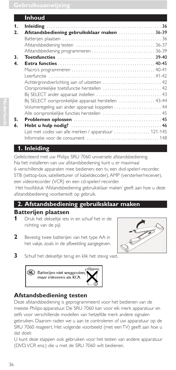 Gefeliciteerd met uw Philips SRU 7060 universele afstandsbediening. Na het installeren van uw afstandsbediening kunt u er maximaal 6 verschillende apparaten mee bedienen: een tv, een dvd-speler/-recorder, STB (settop-box, satelliettuner of kabeldecoder), AMP (versterker/receiver), een videorecorder (VCR) en een cd-speler/-recorder. Het hoofdstuk ‘Afstandsbediening gebruiksklaar maken’ geeft aan hoe u deze afstandsbediening voorbereidt op gebruik.