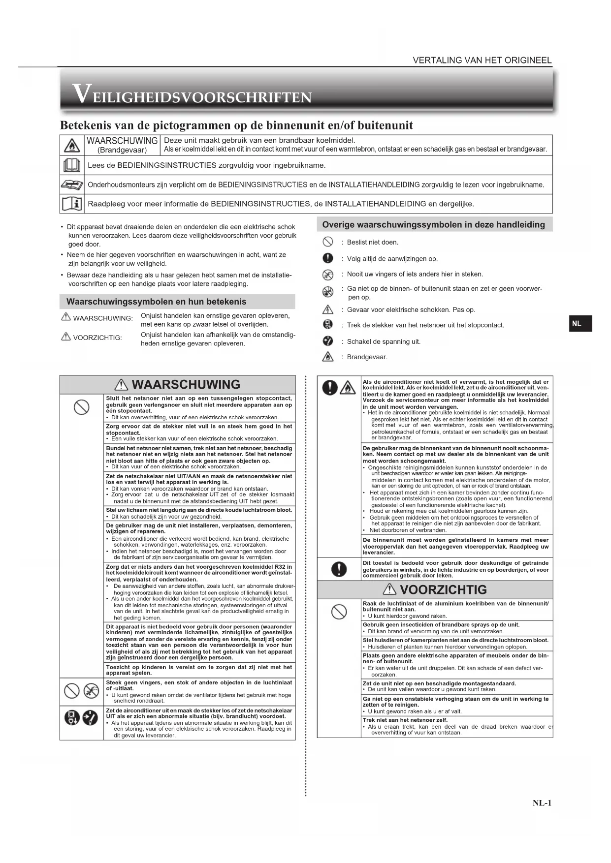 - Dit apparaat bevat draaiende delen en onderdelen die een elektrische schok kunnen veroorzaken. Lees daarom deze veiligheidsvoorschriften voor gebruik goed door.• Neem de hier gegeven voorschriften en waarschuwingen in acht, want ze zijn belangrijk voor uw veiligheid.• Bewaar deze handleiding als u haar gelezen hebt samen met de installatie-voorschriften op een handige plaats voor latere raadpleging. Waarschuwingssymbolen en hun betekenis WAARSCHUWING:Onjuist handelen kan ernstige gevaren opleveren, met een kans op zwaar letsel of overlijden. VOORZICHTIG:Onjuist handelen kan afhankelijk van de omstandig-heden ernstige gevaren opleveren. Overige waarschuwingssymbolen in deze handleiding : Beslist niet doen. : Volg altijd de aanwijzingen op. : Nooit uw vingers of iets anders hier in steken. : Ga niet op de binnen- of buitenunit staan en zet er geen voorwer-pen op. : Gevaar voor elektrische schokken. Pas op. : Trek de stekker van het netsnoer uit het stopcontact. : Schakel de spanning uit. : Brandgevaar. Betekenis van de pictogrammen op de binnenunit en/of buitenunit WAARSCHUWING (Brandgevaar)Deze unit maakt gebruik van een brandbaar koelmiddel. Als er koelmiddel lekt en dit in contact komt met vuur of een warmtebron, ontstaat er een schadelijk gas en bestaat er brandgevaar. Lees de BEDIENINGSINSTRUCTIES zorgvuldig voor ingebruikname. Onderhoudsmonteurs zijn verplicht om de BEDIENINGSINSTRUCTIES en de INSTALLATIEHANDLEIDING zorgvuldig te lezen voor ingebruikname. Raadpleeg voor meer informatie de BEDIENINGSINSTRUCTIES, de INSTALLATIEHANDLEIDING en dergelijke. WAARSCHUWING Sluit het netsnoer niet aan op een tussengelegen stopcontact, gebruik geen verlengsnoer en sluit niet meerdere apparaten aan op één stopcontact.• Dit kan oververhitting, vuur of een elektrische schok veroorzaken.Zorg ervoor dat de stekker niet vuil is en steek hem goed in het stopcontact.• Een vuile stekker kan vuur of een elektrische schok veroorzaken.Bundel het netsnoer niet samen, trek niet aan het netsnoer, beschadig het netsnoer niet en wijzig niets aan het netsnoer. Stel het netsnoer niet bloot aan hitte of plaats er ook geen zware objecten op.• Dit kan vuur of een elektrische schok veroorzaken.Zet de netschakelaar niet UIT/AAN en maak de netsnoerstekker niet los en vast terwijl het apparaat in werking is.• Dit kan vonken veroorzaken waardoor er brand kan ontstaan.• Zorg ervoor dat u de netschakelaar UIT zet of de stekker losmaakt nadat u de binnenunit met de afstandsbediening UIT hebt gezet. Stel uw lichaam niet langdurig aan de directe koude luchtstroom bloot.• Dit kan schadelijk zijn voor uw gezondheid.De gebruiker mag de unit niet installeren, verplaatsen, demonteren, wijzigen of repareren.• Een airconditioner die verkeerd wordt bediend, kan brand, elektrische schokken, verwondingen, waterlekkages, enz. veroorzaken.• Indien het netsnoer beschadigd is, moet het vervangen worden door de fabrikant of zijn serviceorganisatie om gevaar te vermijden.Zorg dat er niets anders dan het voorgeschreven koelmiddel R32 in het koelmiddelcircuit komt wanneer de airconditioner wordt geïnstal-leerd, verplaatst of onderhouden. De aanwezigheid van andere stoffen, zoals lucht, kan abnormale drukver-hoging veroorzaken die kan leiden tot een explosie of lichamelijk letsel. • Als u een ander koelmiddel dan het voorgeschreven koelmiddel gebruikt, kan dit leiden tot mechanische storingen, systeemstoringen of uitval van de unit. In het slechtste geval kan de productveiligheid ernstig in het geding komen.Dit apparaat is niet bedoeld voor gebruik door personen (waaronder kinderen) met verminderde lichamelijke, zintuiglijke of geestelijke vermogens of zonder de vereiste ervaring en kennis, tenzij zij onder toezicht staan van een persoon die verantwoordelijk is voor hun veiligheid of als zij met betrekking tot het gebruik van het apparaat zijn geïnstrueerd door een dergelijke persoon.Toezicht op kinderen is vereist om te zorgen dat zij niet met het apparaat spelen. Steek geen vingers, een stok of andere objecten in de luchtinlaat of -uitlaat.• U kunt gewond raken omdat de ventilator tijdens het gebruik met hoge snelheid ronddraait. Zet de airconditioner uit en maak de stekker los of zet de netschakelaar UIT als er zich een abnormale situatie (bijv. brandlucht) voordoet.• Als het apparaat tijdens een abnormale situatie in werking blijft, kan dit een storing, vuur of een elektrische schok veroorzaken. Raadpleeg in dit geval uw leverancier. Als de airconditioner niet koelt of verwarmt, is het mogelijk dat er koelmiddel lekt. Als er koelmiddel lekt, zet u de airconditioner uit, ven-tileert u de kamer goed en raadpleegt u onmiddellijk uw leverancier. Verzoek de servicemonteur om meer informatie als het koelmiddel in de unit moet worden vervangen.• Het in de airconditioner gebruikte koelmiddel is niet schadelijk. Normaal gesproken lekt het niet. Als er echter koelmiddel lekt en dit in contact komt met vuur of een warmtebron, zoals een ventilatorverwarming, petroleumkachel of fornuis, ontstaat er een schadelijk gas en bestaat er brandgevaar.De gebruiker mag de binnenkant van de binnenunit nooit schoonma-ken. Neem contact op met uw dealer als de binnenkant van de unit moet worden schoongemaakt.• Ongeschikte reinigingsmiddelen kunnen kunststof onderdelen in de unit beschadigen waardoor er water kan gaan lekken. Als reinigings-middelen in contact komen met elektrische onderdelen of de motor, kan er een storing de unit optreden, of kan er rook of brand ontstaan.• Het apparaat moet zich in een kamer bevinden zonder continu func-tionerende ontstekingsbronnen (zoals open vuur, een functionerend gastoestel of een functionerende elektrische kachel).• Houd er rekening mee dat koelmiddelen geurloos kunnen zijn.• Gebruik geen middelen om het ontdooiingsproces te versnellen of het apparaat te reinigen die niet zijn aanbevolen door de fabrikant. • Niet doorboren of verbranden.De binnenunit moet worden geïnstalleerd in ka