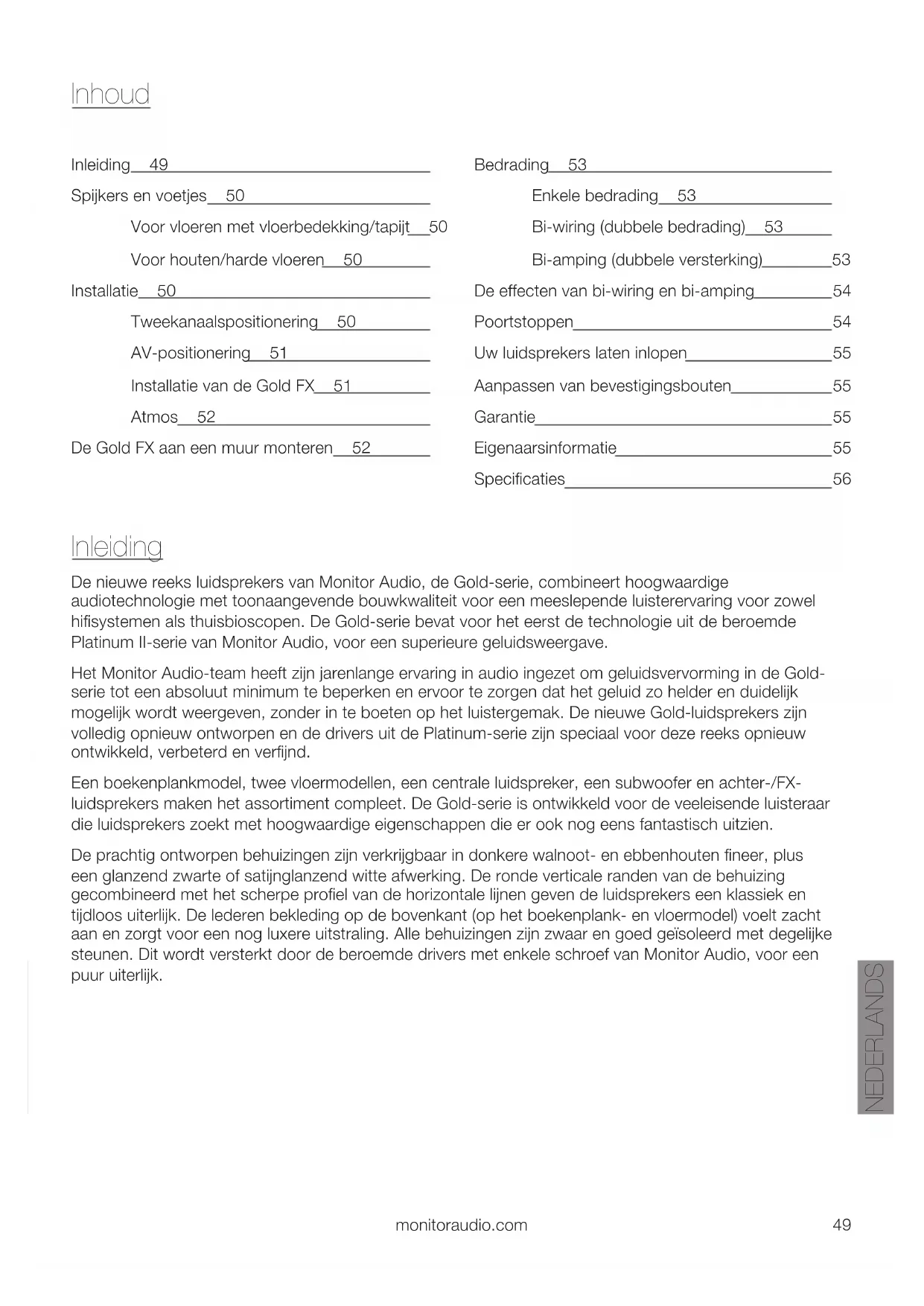 1 x transdutor de alta frequência MPD 2 x altifalantes de frequências baixas/ médias C-CAM de 4" 2 x transdutores de alta frequência MPD Dimensões externas incluindo grelha e terminais (A x L x P) 360 x 195 x 330,6 mm 950 x 195 x 330,6 mm 1000 x 240 x 360,6 mm 205 x 537 x 330,6 mm 270 x 341,8 x 160 mm Dimensões externas incluindo suportes de ancoragem, pés e espigões (A x L x P) N/A 997 x 282,8 x 387,8 mm 1047 x 327,8 x 417,8 mm N/A N/A Peso (cada) 9,12 kg 21,86 kg 30,56 kg 14,48 kg 6,2 kg Acabamentos Preto Piano, Ébano Piano, Branco Acetinado, Nogueira Escura Gold Series48Inhoud Inleiding De nieuwe reeks luidsprekers van Monitor Audio, de Gold-serie, combineert hoogwaardige audiotechnologie met toonaangevende bouwkwaliteit voor een meeslepende luisterervaring voor zowel hifisystemen als thuisbioscopen. De Gold-serie bevat voor het eerst de technologie uit de beroemde Platinum II-serie van Monitor Audio, voor een superieure geluidsweergave. Het Monitor Audio-team heeft zijn jarenlange ervaring in audio ingezet om geluidsvervorming in de Gold- serie tot een absoluut minimum te beperken en ervoor te zorgen dat het geluid zo helder en duidelijk mogelijk wordt weergeven, zonder in te boeten op het luistergemak. De nieuwe Gold-luidsprekers zijn volledig opnieuw ontworpen en de drivers uit de Platinum-serie zijn speciaal voor deze reeks opnieuw ontwikkeld, verbeterd en verfijnd. Een boekenplankmodel, twee vloermodellen, een centrale luidspreker, een subwoofer en achter-/FX- luidsprekers maken het assortiment compleet. De Gold-serie is ontwikkeld voor de veeleisende luisteraar die luidsprekers zoekt met hoogwaardige eigenschappen die er ook nog eens fantastisch uitzien. De prachtig ontworpen behuizingen zijn verkrijgbaar in donkere walnoot- en ebbenhouten fineer, plus een glanzend zwarte of satijnglanzend witte afwerking. De ronde verticale randen van de behuizing gecombineerd met het scherpe profiel van de horizontale lijnen geven de luidsprekers een klassiek en tijdloos uiterlijk. De lederen bekleding op de bovenkant (op het boekenplank- en vloermodel) voelt zacht aan en zorgt voor een nog luxere uitstraling. Alle behuizingen zijn zwaar en goed geïsoleerd met degelijke steunen. Dit wordt versterkt door de beroemde drivers met enkele schroef van Monitor Audio, voor een puur uiterlijk. Inleiding 49 Spijkers en voetjes 50 Voor vloeren met vloerbedekking/tapijt 50 Voor houten/harde vloeren 50 Installatie 50 Tweekanaalspositionering 50 AV-positionering 51 Installatie van de Gold FX 51 Atmos 52 De Gold FX aan een muur monteren 52 Bedrading 53 Enkele bedrading 53 Bi-wiring (dubbele bedrading) 53 Bi-amping (dubbele versterking) 53 De effecten van bi-wiring en bi-amping 54 Poortstoppen 54 Uw luidsprekers laten inlopen 55 Aanpassen van bevestigingsbouten 55 Garantie 55 Eigenaarsinformatie 55 Specificaties 56 NEDERLANDS monitoraudio.com 49Spijkers en voetjes Voor vloeren met vloerbedekking/tapijt (alleen de Gold 200 en 300) De voetjes en 'uithouders' zijn inbegrepen en klaar om te worden gebruikt op vloeren met vloerbedekking/ tapijt of waar spijkers nodig zijn. U hoeft ze alleen maar aan de onderzijde van de luidspreker te bevestigen met de meegeleverde bouten (A en B). Met de waterpas kunt u controleren of de luidspreker aan alle kanten recht staat. Als hij niet helemaal recht staat, schroef dan het voetje op het laagste punt iets losser. Herhaal dit tot de luidspreker helemaal recht staat. Gebruik de borgmoeren op de voetjes om ze vast te zetten en ongewenste trillingen te voorkomen. Let erop dat er geen verborgen bedrading onder de vloerbedekking ligt die beschadigd zou kunnen raken door de spijkers. Voor houten/harde vloeren (alleen de Gold 200 en 300) Verwijder de spijkers en bevestig de voetjes en 'uithouders' aan de onderzijde van de luidspreker met de meegeleverde bouten (A en B). Met een waterpas kunt u controleren of de luidspreker aan alle kanten recht staat. Als hij niet helemaal recht staat, schroef dan het voetje op het laagste punt iets losser. Herhaal dit tot de luidspreker helemaal recht staat. Gebruik de borgmoeren op de voetjes om ze vast te zetten en ongewenste trillingen te voorkomen. Installatie Tweekanaalspositionering Bij het positioneren van een tweekanaalssysteem moet de luisterpositie samen met de luidsprekers een gelijkzijdige driehoek vormen. De luidsprekers moeten tussen de 1,8 en 3 meter van elkaar af staan. De ideale afstand vanaf de achterste muur varieert, afhankelijk van de luidspreker (zie de lijst hieronder). Voor optimale prestaties moeten de luidsprekers echter minimaal 91 cm van de zijmuren af staan.