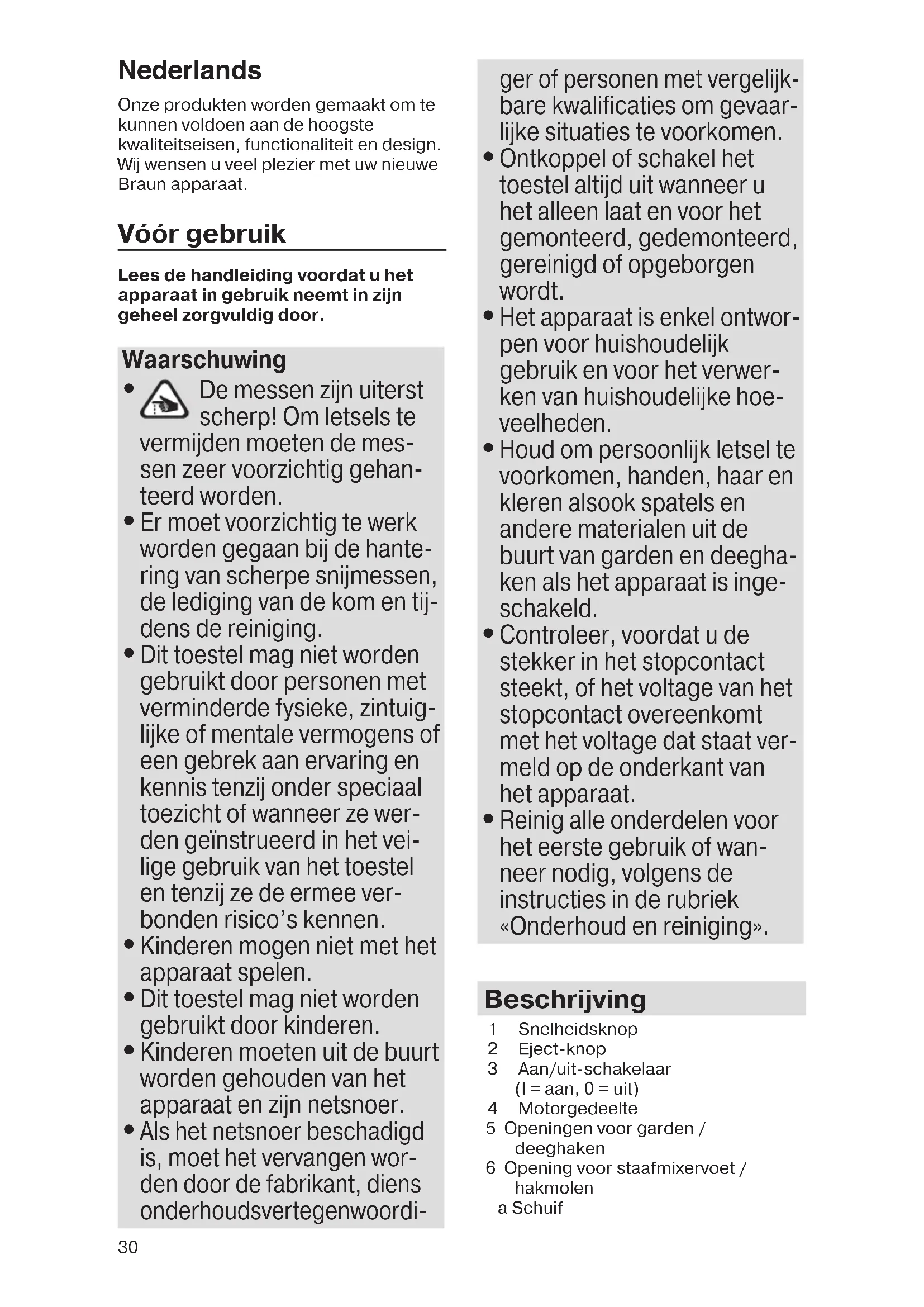 Reinig alle onderdelen voor het eerste gebruik of wan- neer nodig, volgens de instructies in de rubriek «Onderhoud en reiniging». Beschrijving 1 Snelheidsknop 2 Eject-knop 3 Aan/uit-schakelaar (I = aan, 0 = uit) 4 Motorgedeelte 5 Openingen voor garden / deeghaken 6 Opening voor staafmixervoet / hakmolen a Schuif 5722210254_HM 5000_5137 INT_S06_100.indd 30 23.05.17 13:1031 7 Deeghaken 8 Garden