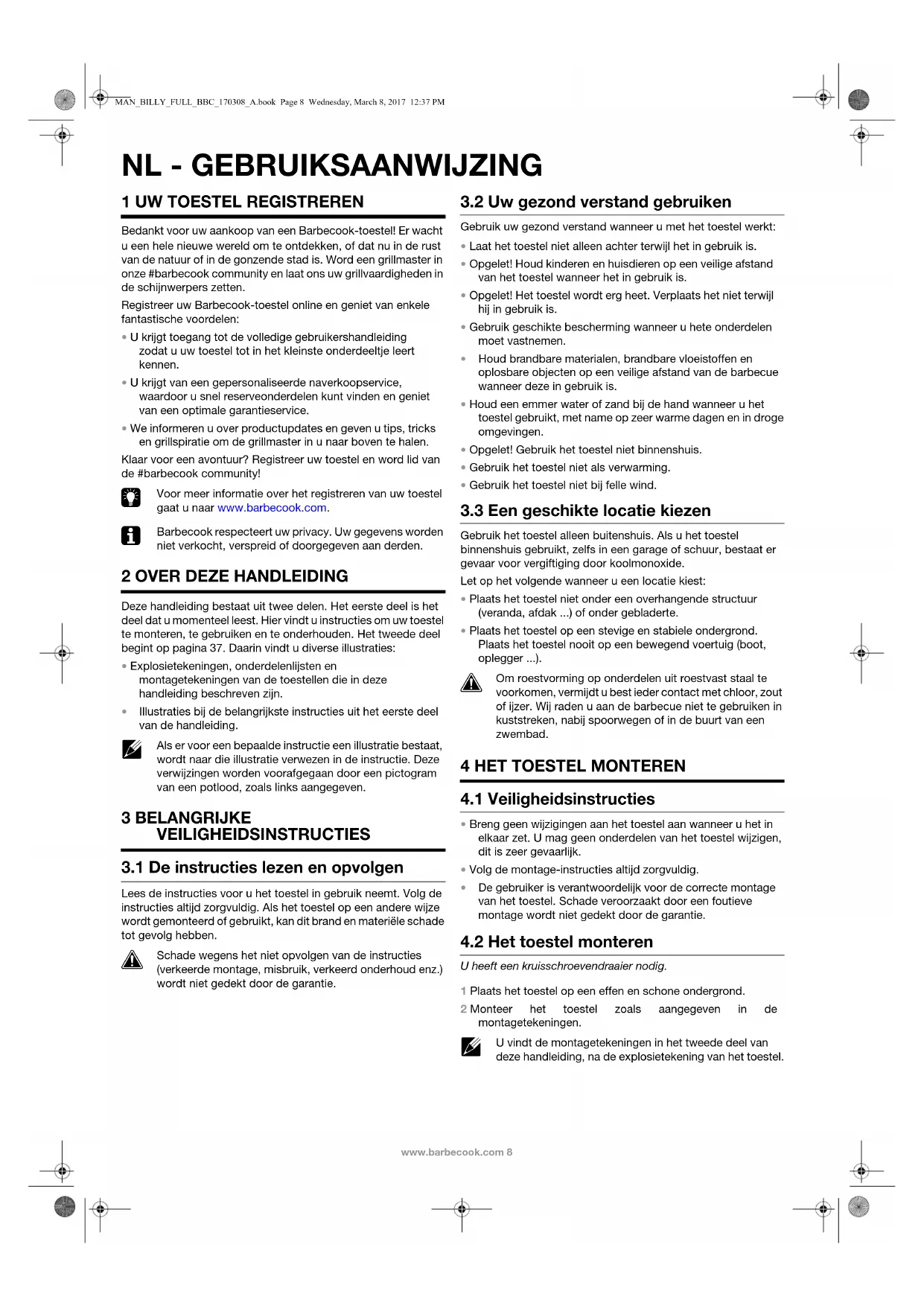 U vindt de montagetekeningen in het tweede deel van deze handleiding, na de explosietekening van het toestel. MAN_BILLY_FULL_BBC_170308_A.book Page 8 Wednesday, March 8, 2017 12:37 PMwww.barbecook.com 9