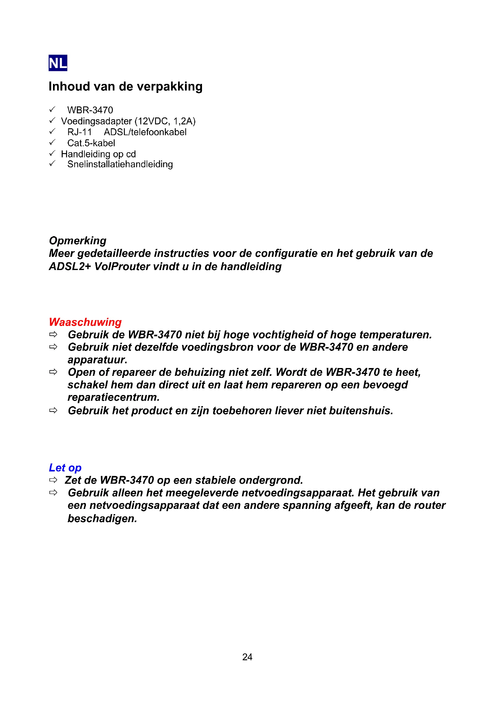 Waaschuwing Gebruik de WBR-3470 niet bij hoge vochtigheid of hoge temperaturen. Gebruik niet dezelfde voedingsbron voor de WBR-3470 en andere apparatuur. Open of repareer de behuizing niet zelf. Wordt de WBR-3470 te heet, schakel hem dan direct uit en laat hem repareren op een bevoegd reparatiecentrum. Gebruik het product en zijn toebehoren liever niet buitenshuis.