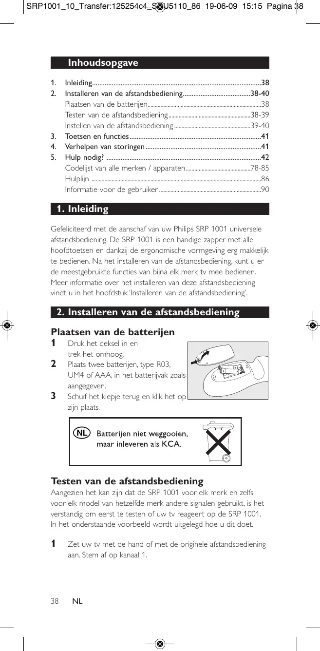 Inleiding38 Installeren van de afstandsbediening38-40 Plaatsen van de batterijen38 Testen van de afstandsbediening38-39 Instellen van de afstandsbediening 39-40 Toetsen en functies41 Verhelpen van storingen41 Hulp nodig? 42 Codelijst van alle merken / apparaten78-85 Hulplijn 86 Informatie voor de gebruiker 90