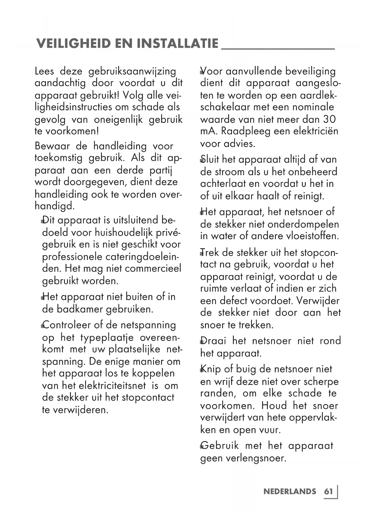 Het apparaat niet buiten of in de badkamer gebruiken.