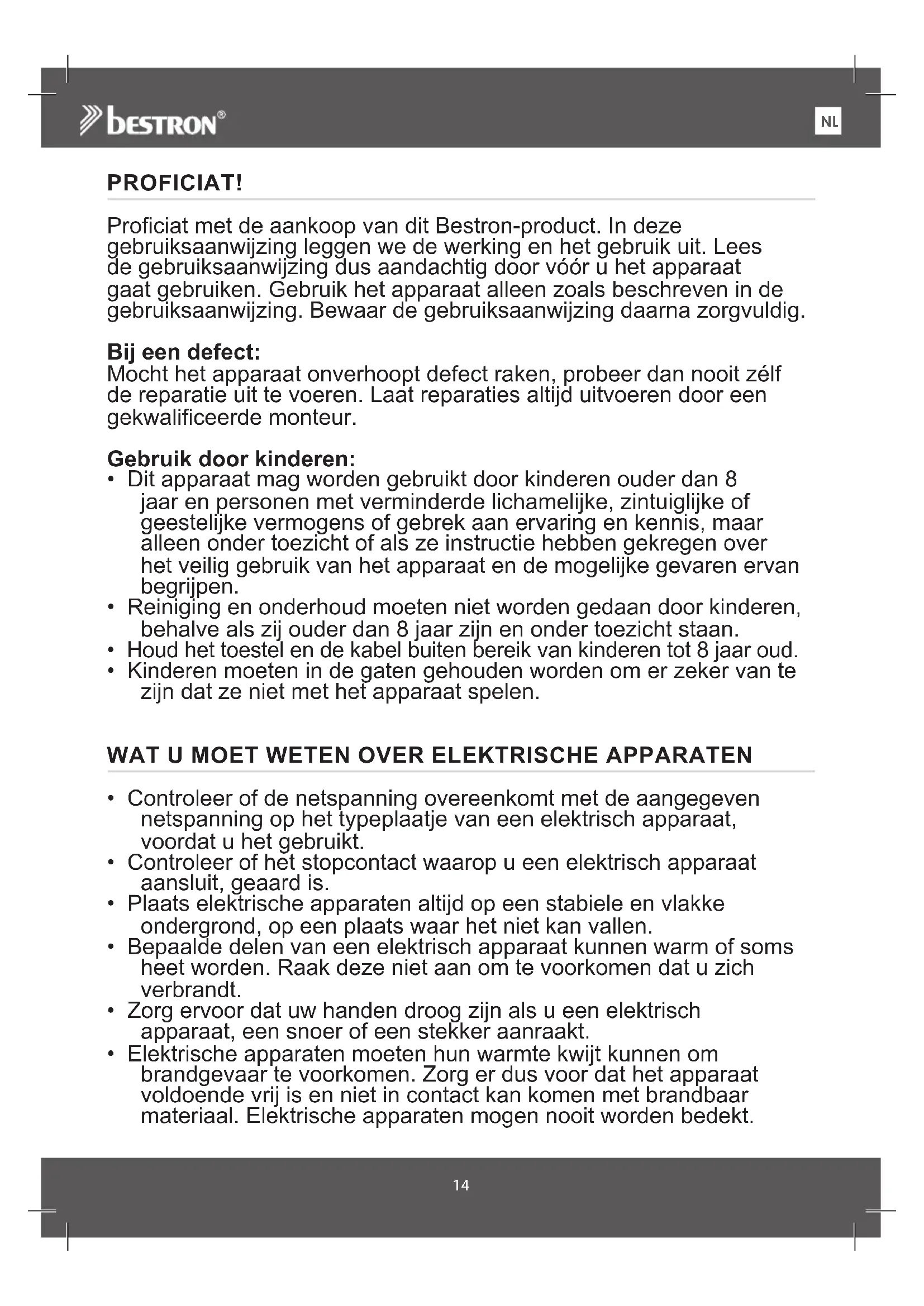 PROFICIAT! Proficiat met de aankoop van dit Bestron-product. In deze gebruiksaanwijzing leggen we de werking en het gebruik uit. Lees de gebruiksaanwijzing dus aandachtig door vóór u het apparaat gaat gebruiken. Gebruik het apparaat alleen zoals beschreven in de gebruiksaanwijzing. Bewaar de gebruiksaanwijzing daarna zorgvuldig. Bij een defect: Mocht het apparaat onverhoopt defect raken, probeer dan nooit zélf de reparatie uit te voeren. Laat reparaties altijd uitvoeren door een gekwalificeerde monteur. Gebruik door kinderen: