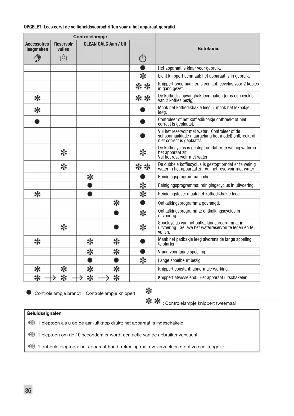 Gevaar: Waarschuwing voor risico’s van ernstige of dodelijke lichamelijke verwondingen. Het bliksempje waarschuwt tegen gevaar door de aanwezigheid van elektriciteit. Let op: Waarschuwing voor mogelijke storingen of beschadiging of vernietiging van het apparaat. Belangrijk: Algemene of belangrijke opmerking over de werking van het apparaat. Pictogrammen en waarschuwingstekens Leeg de kofedik-opvangbak en het lekbakje: het controlelampje blijft branden als de kofedik-opvangbak ver- keerd is ingeduwd of binnen 4 seconden op zijn plaats is aangebracht. Vul het waterreservoir Stel de maaljnheid van de kofebonen in CLEAN Reinig de machine Kofe normale sterkte Sterke kofe CALC Ontkalk de machine Stoomknop CLEAN + CALC Voer de lange spoeling uit Spoelen/onderhoud38 DRANKEN BEREIDEN KOFFIE RECEPTEN Aantal mogelijke kopjes Mogelijke instellingen volume (ml) Mogelijke instellingen sterkte RISTRETTO 1 20 tot 30 ml