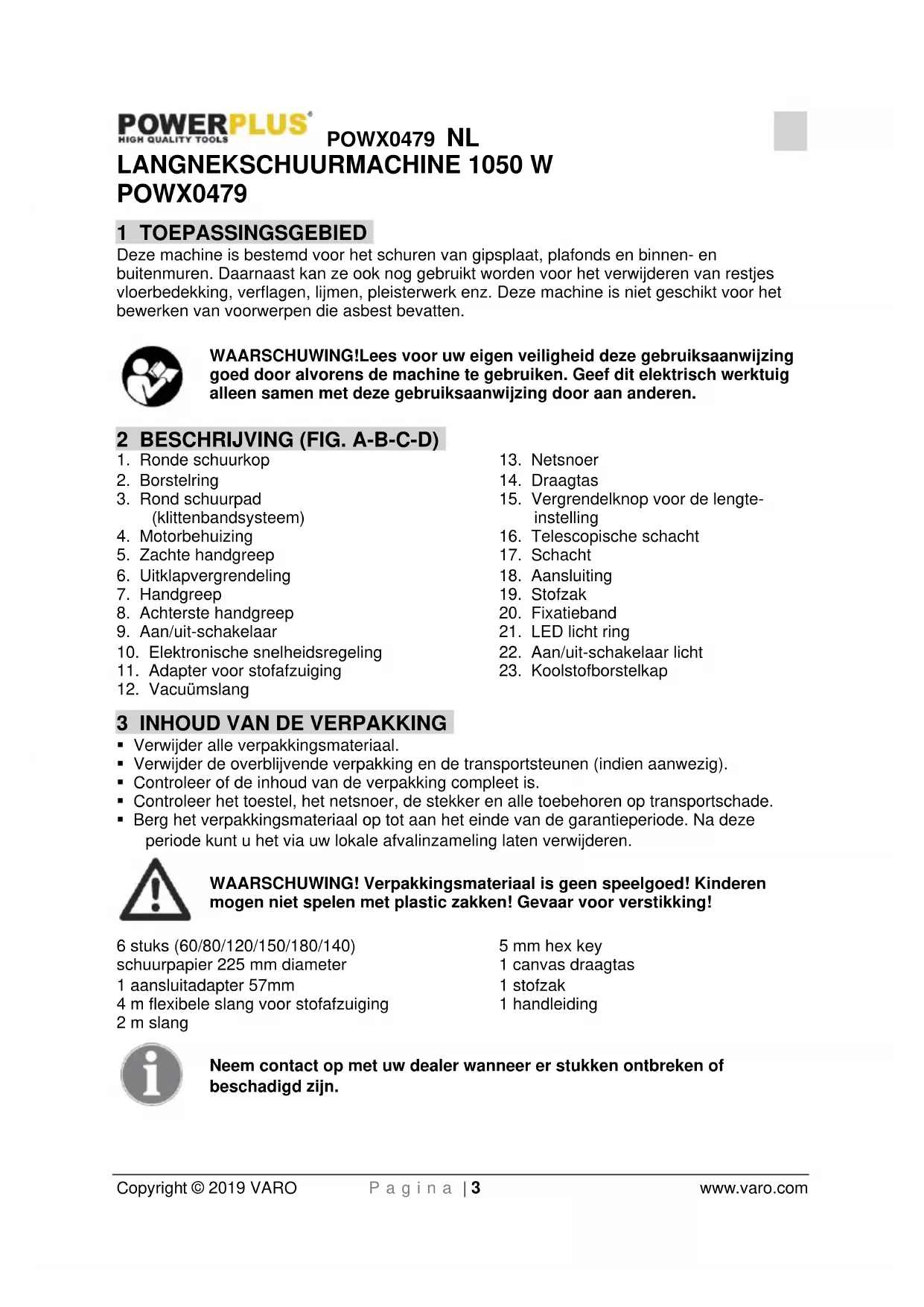 - Berg het verpakkingsmateriaal op tot aan het einde van de garantieperiode. Na deze periode kunt u het via uw lokale afvalinzameling laten verwijderen. WAARSCHUWING! Verpakkingsmateriaal is geen speelgoed! Kinderen mogen niet spelen met plastic zakken! Gevaar voor verstikking! 6 stuks (60/80/120/150/180/140) schuurpapier 225 mm diameter 1 aansluitadapter 57mm 4 m flexibele slang voor stofafzuiging 2 m slang 5 mm hex key 1 canvas draagtas 1 stofzak 1 handleiding Neem contact op met uw dealer wanneer er stukken ontbreken of beschadigd zijn.POWX0479 NL Copyright © 2019 VARO P a g i n a | 4 www.varo.com