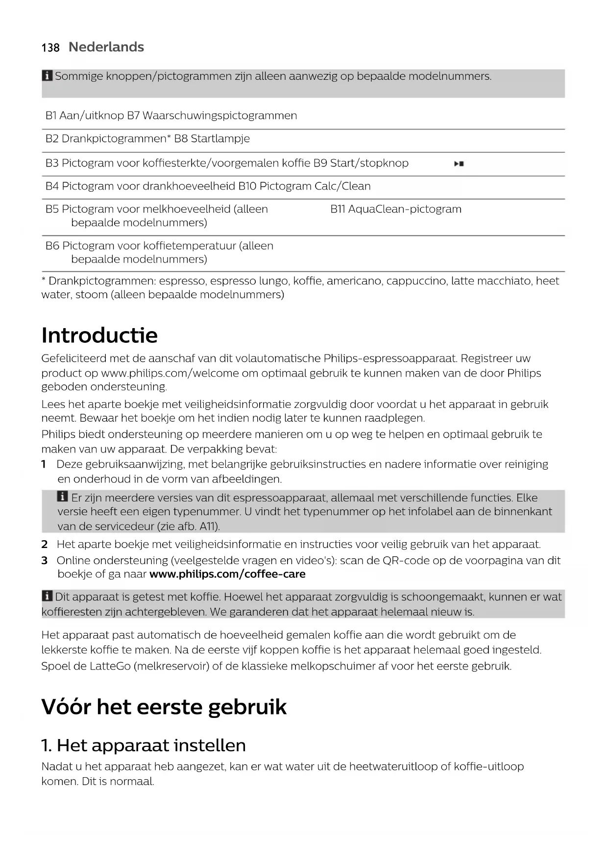 - Drankpictogrammen: espresso, espresso lungo, koffie, americano, cappuccino, latte macchiato, heet water, stoom (alleen bepaalde modelnummers) Introductie Gefeliciteerd met de aanschaf van dit volautomatische Philips-espressoapparaat. Registreer uw product op www.philips.com/welcome om optimaal gebruik te kunnen maken van de door Philips geboden ondersteuning. Lees het aparte boekje met veiligheidsinformatie zorgvuldig door voordat u het apparaat in gebruik neemt. Bewaar het boekje om het indien nodig later te kunnen raadplegen. Philips biedt ondersteuning op meerdere manieren om u op weg te helpen en optimaal gebruik te maken van uw apparaat. De verpakking bevat: 1 Deze gebruiksaanwijzing, met belangrijke gebruiksinstructies en nadere informatie over reiniging en onderhoud in de vorm van afbeeldingen. Er zijn meerdere versies van dit espressoapparaat, allemaal met verschillende functies. Elke versie heeft een eigen typenummer. U vindt het typenummer op het infolabel aan de binnenkant van de servicedeur (zie afb. A11). 2 Het aparte boekje met veiligheidsinformatie en instructies voor veilig gebruik van het apparaat. 3 Online ondersteuning (veelgestelde vragen en video's): scan de QR-code op de voorpagina van dit boekje of ga naar www.philips.com/coffee-care Dit apparaat is getest met koffie. Hoewel het apparaat zorgvuldig is schoongemaakt, kunnen er wat koffieresten zijn achtergebleven. We garanderen dat het apparaat helemaal nieuw is. Het apparaat past automatisch de hoeveelheid gemalen koffie aan die wordt gebruikt om de lekkerste koffie te maken. Na de eerste vijf koppen koffie is het apparaat helemaal goed ingesteld. Spoel de LatteGo (melkreservoir) of de klassieke melkopschuimer af voor het eerste gebruik. Vóór het eerste gebruik