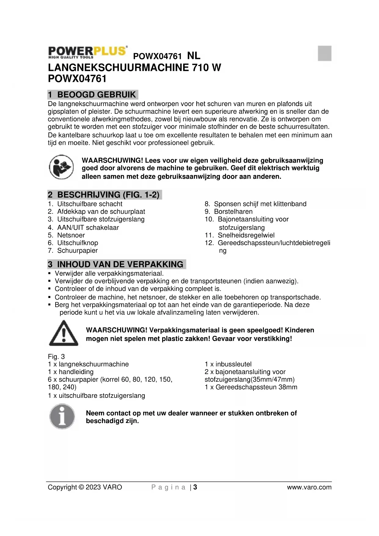 - Berg het verpakkingsmateriaal op tot aan het einde van de garantieperiode. Na deze periode kunt u het via uw lokale afvalinzameling laten verwijderen. WAARSCHUWING! Verpakkingsmateriaal is geen speelgoed! Kinderen mogen niet spelen met plastic zakken! Gevaar voor verstikking! Fig. 3 1 x langnekschuurmachine 1 x handleiding 6 x schuurpapier (korrel 60, 80, 120, 150, 180, 240) 1 x uitschuifbare stofzuigerslang 1 x inbussleutel 2 x bajonetaansluiting voor stofzuigerslang(35mm/47mm) 1 x Gereedschapssteun 38mm Neem contact op met uw dealer wanneer er stukken ontbreken of beschadigd zijn.POWX04761 NL Copyright © 2023 VARO P a g i n a | 4 www.varo.com