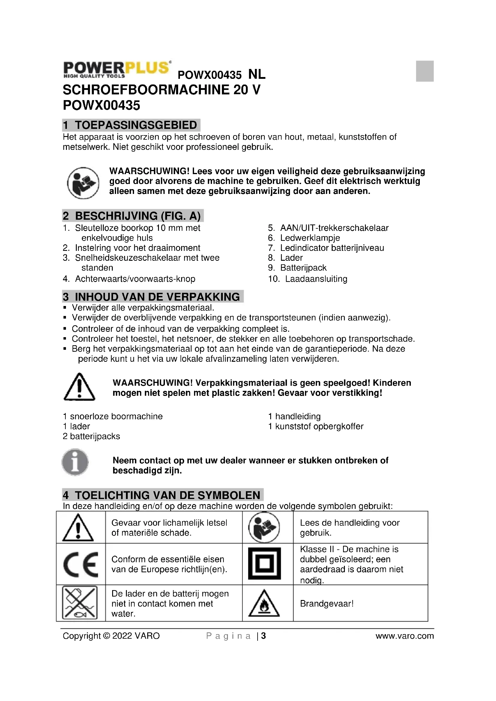 Dit product bevat Lithiumionen. Recycleer of verwijder de batterij op passende wijze om het milieu te sparen. Lokale, regionale of nationale wetgeving kan het wegwerpen van Lithium-ion batterijen bij het gewone huisvuil verbieden. Neem contact op met uw lokale afvalverwerker voor informatie m.b.t. recyclage- en verwijderingsmogelijkheden. 15 CONFORMITEITSVERKLARING VARO N.V. Vic. Van Rompuy N.V. - Joseph Van Instraat 9 - BE2500 Lier - BELGIUM, verklaart dat, Product: Schroefboormachine Handelsmerk: POWERplus Model: POWX00435 voldoet aan de essentiële eisen en aan de overige relevante bepalingen van de van toepassing zijnde Europese Richtlijnen, gebaseerd op de toepassing van Europese geharmoniseerde normen. Elke niet-toegelaten modificatie van het apparaat maakt deze verklaring nietig. Europese Richtlijnen (inclusief, indien van toepassing, hun wijzigingen tot op de datum van ondertekening): 2011/65/EU 2006/42/EC 2014/30/EU Europese geharmoniseerde normen (inclusief, indien van toepassing, hun wijzigingen tot op de datum van ondertekening): EN62841-1 : 2015 EN62841-2-1 : 2018 EN55014-1:2017 EN55014-2 : 2015 Beheerder van de technische documentatie: Philippe Vankerkhove, VARO – Vic. Van Rompuy N.V. Ondergetekende handelt in opdracht van de bedrijfsleider, Ludo Mertens Regelgevings- en compliancemanager 07/01/2022, Lier - BelgiumPOWX00435 FR Copyright © 2022 VARO P a g e | 1 www.varo.com 1 UTILISATION .................................................................................. 3