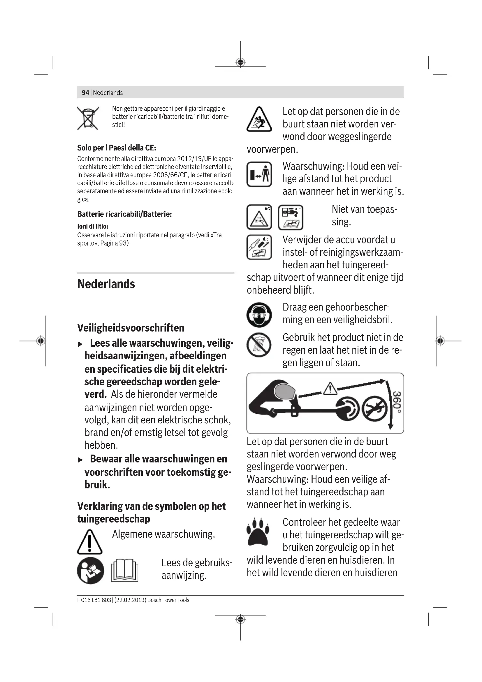a.c. Niet van toepas- sing. d.c. Verwijder de accu voordat u instel- of reinigingswerkzaam- heden aan het tuingereed- schap uitvoert of wanneer dit enige tijd onbeheerd blijft. Draag een gehoorbescher- ming en een veiligheidsbril. Gebruik het product niet in de regen en laat het niet in de re- gen liggen of staan. Let op dat personen die in de buurt staan niet worden verwond door weg- geslingerde voorwerpen. Waarschuwing: Houd een veilige af- stand tot het tuingereedschap aan wanneer het in werking is. Controleer het gedeelte waar u het tuingereedschap wilt ge- bruiken zorgvuldig op in het wild levende dieren en huisdieren. In het wild levende dieren en huisdieren F 016 L81 803 | (22.02.2019) Bosch Power ToolsNederlands | 95 kunnen tijdens het gebruik van de ma- chine gewond raken. Controleer het gedeelte waar u de machine wilt ge- bruiken grondig en verwijder alle ste- nen, stokken, draden, botten en ande- re voorwerpen. Let er bij het gebruik van de machine op dat er geen in het wild levende dieren, huisdieren of klei- ne boomstronken in dicht gras verbor- gen zijn. Algemene veiligheidsaanwijzingen voor elektrische gereedschappen u Lees alle waarschuwingen, veilig- heidsaanwijzingen, afbeeldingen en specificaties die bij dit elektri- sche gereedschap worden gele- verd. Als de hieronder vermelde aanwijzingen niet worden opge- volgd, kan dit een elektrische schok, brand en/of ernstig letsel tot gevolg hebben. u Bewaar alle waarschuwingen en voorschriften voor toekomstig ge- bruik. u Het in de waarschuwingen gebruikte begrip elektrisch gereedschap heeft betrekking op elektrische gereed- schappen voor gebruik op het stroomnet (met netsnoer) en op elektrische gereedschappen voor ge- bruik met een accu (zonder net- snoer). Veiligheid van de werkomgeving u Houd uw werkomgeving schoon en goed verlicht. Een rommelige of on- verlichte werkomgeving kan tot on- gevallen leiden. u Werk met het elektrische gereed- schap niet in een omgeving met explosiegevaar waarin zich brand- bare vloeistoffen, brandbare gas- sen of brandbaar stof bevinden. Elektrische gereedschappen veroor- zaken vonken die het stof of de dam- pen tot ontsteking kunnen brengen. u Houd kinderen en andere perso- nen tijdens het gebruik van het elektrische gereedschap uit de buurt. Wanneer u wordt afgeleid, kunt u de controle over het gereed- schap verliezen. Elektrische veiligheid u De aansluitstekker van het elektri- sche gereedschap moet in het stopcontact passen. De stekker mag in geen geval worden veran- derd. Gebruik geen adapterstek- kers in combinatie met geaarde elektrische gereedschappen. On- veranderde stekkers en passende stopcontacten beperken het risico van een elektrische schok. u Voorkom aanraking van het li- chaam met geaarde oppervlakken, bijvoorbeeld van buizen, verwar- mingen, fornuizen en koelkasten. Er bestaat een verhoogd risico door een elektrische schok wanneer uw li- chaam geaard is. u Houd het gereedschap uit de buurt van regen en vocht. Het binnen- Bosch Power Tools F 016 L81 803 | (22.02.2019)96 | Nederlands dringen van water in het elektrische gereedschap vergroot het risico van een elektrische schok. u Gebruik de kabel niet voor een verkeerd doel, om het elektrische gereedschap te dragen of op te hangen of om de stekker uit het stopcontact te trekken. Houd de kabel uit de buurt van hitte, olie, scherpe randen of bewegende de- len. Beschadigde of in de war ge- raakte kabels vergroten het risico van een elektrische schok. u Wanneer u buitenshuis met elek- trisch gereedschap werkt, dient u alleen verlengkabels te gebruiken die voor gebruik buitenshuis zijn goedgekeurd. Het gebruik van een voor gebruik buitenshuis geschikte verlengkabel beperkt het risico van een elektrische schok. u Als het gebruik van het elektrische gereedschap in een vochtige om- geving onvermijdelijk is, dient u een aardlekschakelaar te gebrui- ken. Het gebruik van een aardlek- schakelaar vermindert het risico van een elektrische schok. Veiligheid van personen u Wees alert, let goed op wat u doet en ga met verstand te werk bij het gebruik van het elektrische ge- reedschap. Gebruik geen elek- trisch gereedschap, wanneer u moe bent of onder invloed staat van drugs, alcohol of medicijnen. Een moment van onoplettendheid bij het gebruik van het elektrische ge- reedschap kan tot ernstige verwon- dingen leiden. u Draag persoonlijke beschermings- middelen. Draag altijd een veilig- heidsbril. Het dragen van persoon- lijke beschermingsmiddelen zoals een stofmasker, slipvaste werk- schoenen, een veiligheidshelm of ge- hoorbescherming, afhankelijk van de aard en het gebruik van het elektri- sche gereedschap, vermindert het ri- sico van verwondingen. u Voorkom per ongeluk inschake- len. Controleer dat het elektrische gereedschap uitgeschakeld is, voordat u de stekker in het stop- contact steekt of de accu aansluit en voordat u het gereedschap op- pakt of draagt. Wanneer u bij het dragen van het elektrische gereed- schap uw vinger aan de schakelaar hebt of wanneer u het gereedschap ingeschakeld op de stroomvoorzie- ning aansluit, kan dit tot ongevallen leiden. u Verwijder instelgereedschappen of schroefsleutels, voordat u het elektrische gereedschap inscha- kelt. Een instelgereedschap of sleu- tel in een draaiend deel van het ge- reedschap kan tot verwondingen lei- den. u Voorkom een onevenwichtige li- chaamshouding. Zorg ervoor dat u stevig staat en steeds in even- F 016 L81 803 | (22.02.2019) Bosch Power ToolsNederlands | 97 wicht blijft. Daardoor kunt u het elektrische gereedschap in onver- wachte situaties beter onder contro- le houden. u Draag geschikte kleding. Draag geen loshangende kleding of siera- den. Houd haren en kleding uit de buurt van bewegende delen. Los- hangende kleding, lange haren en sieraden kunnen door bewegende delen worden meegenomen. u Wanneer stofafzuigings- of stofop- vangvoorzieningen kunnen wor- den gemonteerd, dient u zich er- van te verzekeren dat deze zijn aangesloten en juist worden ge- bruikt. Het gebruik van een 