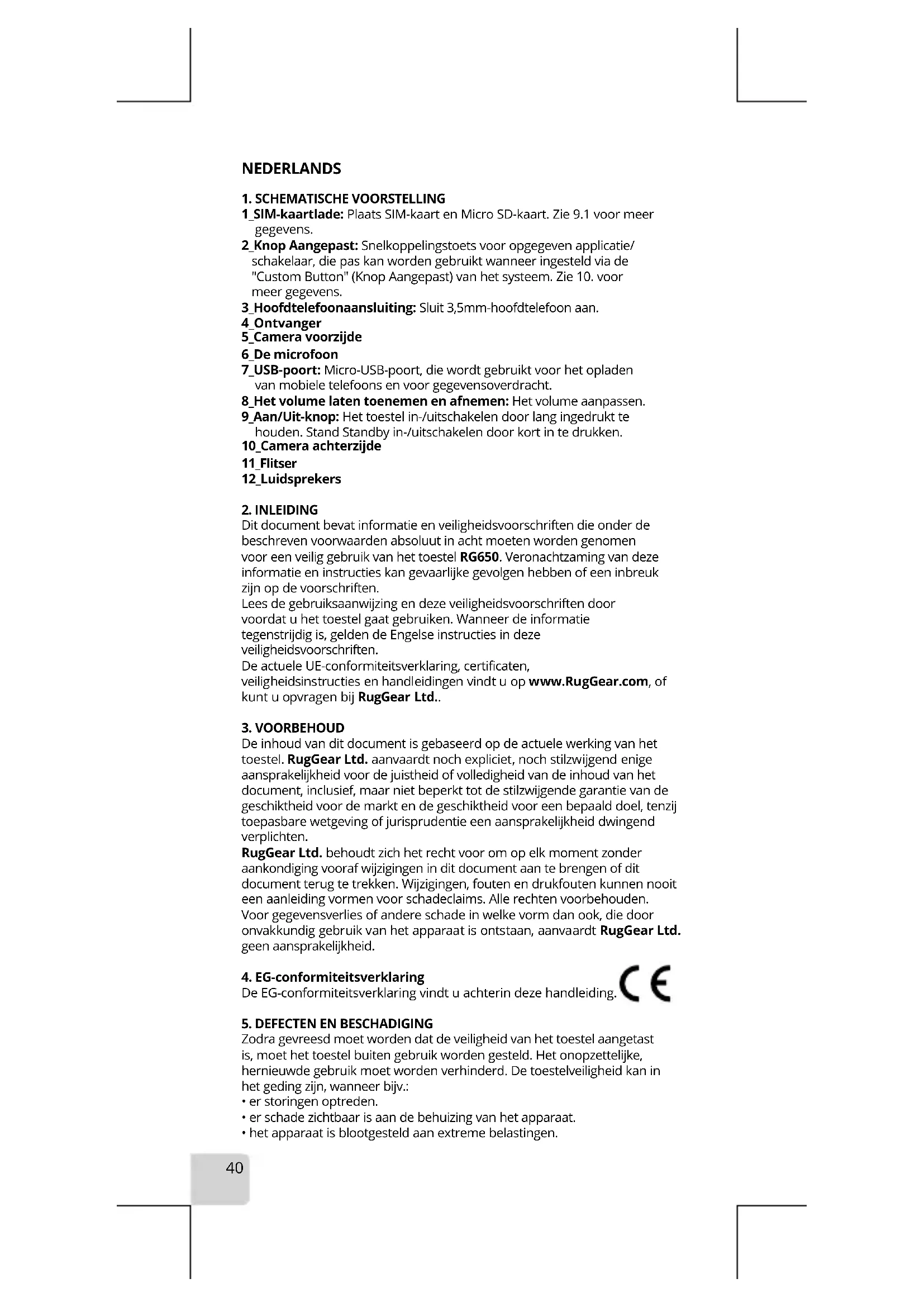 Dit document bevat informatie en veiligheidsvoorschriften die onder de beschreven voorwaarden absoluut in acht moeten worden genomen voor een veilig gebruik van het toestel RG650. Veronachtzaming van deze informatie en instructies kan gevaarlijke gevolgen hebben of een inbreuk zijn op de voorschriften. Lees de gebruiksaanwijzing en deze veiligheidsvoorschriften door voordat u het toestel gaat gebruiken. Wanneer de informatie tegenstrijdig is, gelden de Engelse instructies in deze veiligheidsvoorschriften. De actuele UE-conformiteitsverklaring, certificaten, veiligheidsinstructies en handleidingen vindt u op www.RugGear.com, of kunt u opvragen bij RugGear Ltd..