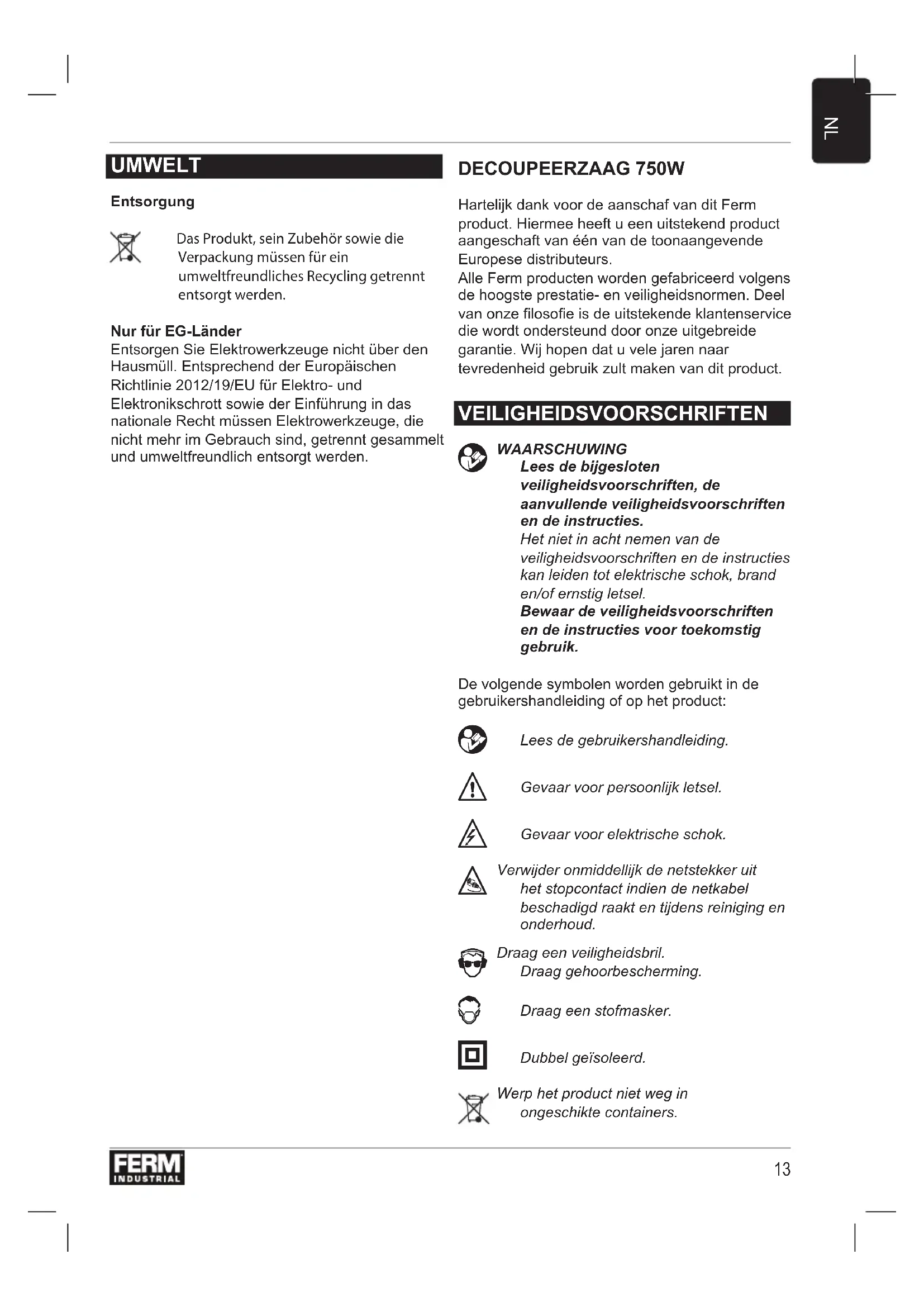 Gebruik uitsluitend scherpe en onbeschadigde zaagbladen. ● Ga voor het verwijderen van het oude zaagblad (14) te werk zoals beschreven in het gedeelte „Monteren en verwijderen van het zaagblad“. ● Ga voor het monteren van het nieuwe zaagblad (14) te werk zoals beschreven in het gedeelte „Monteren en verwijderen van het zaagblad“. GARANTIE Raadpleeg de bijgesloten garantiebepalingen. MILIEU Afdanking Het product, de accessoires en de verpakking moeten worden gesorteerd voor milieuvriendelijke recycling. Uitsluitend voor EG-landen Werp elektrisch gereedschap niet weg bij het huisvuil. Volgens de Europese Richtlijn 2012/19/EU voor Afgedankte Elektrische en Elektronische Apparatuur en de implementatie ervan in nationaal recht moet niet langer te gebruiken elektrisch gereedschap gescheiden worden verzameld en op een milieuvriendelijke wijze worden verwerkt.