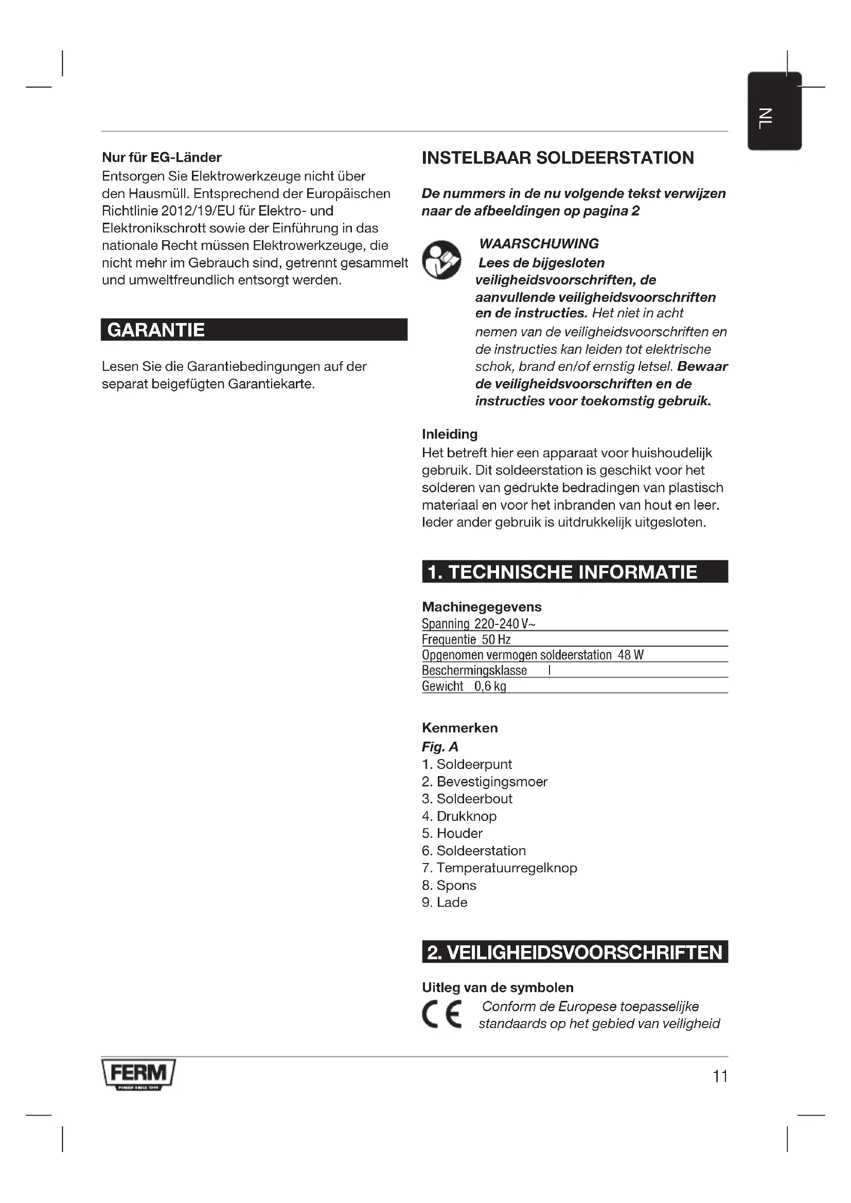 Nur für EG-Länder Entsorgen Sie Elektrowerkzeuge nicht über den Hausmüll. Entsprechend der Europäischen Richtlinie 2012/19/EU für Elektro- und Elektronikschrott sowie der Einführung in das nationale Recht müssen Elektrowerkzeuge, die nicht mehr im Gebrauch sind, getrennt gesammelt und umweltfreundlich entsorgt werden. GARANTIE Lesen Sie die Garantiebedingungen auf der separat beigefügten Garantiekarte. INSTELBAAR SOLDEERSTATION De nummers in de nu volgende tekst verwijzen naar de afbeeldingen op pagina 2 WAARSCHUWING Lees de bijgesloten veiligheidsvoorschriften, de aanvullende veiligheidsvoorschriften en de instructies. Het niet in acht nemen van de veiligheidsvoorschriften en de instructies kan leiden tot elektrische schok, brand en/of ernstig letsel. Bewaar de veiligheidsvoorschriften en de instructies voor toekomstig gebruik. Inleiding Het betreft hier een apparaat voor huishoudelijk gebruik. Dit soldeerstation is geschikt voor het solderen van gedrukte bedradingen van plastisch materiaal en voor het inbranden van hout en leer. Ieder ander gebruik is uitdrukkelijk uitgesloten.