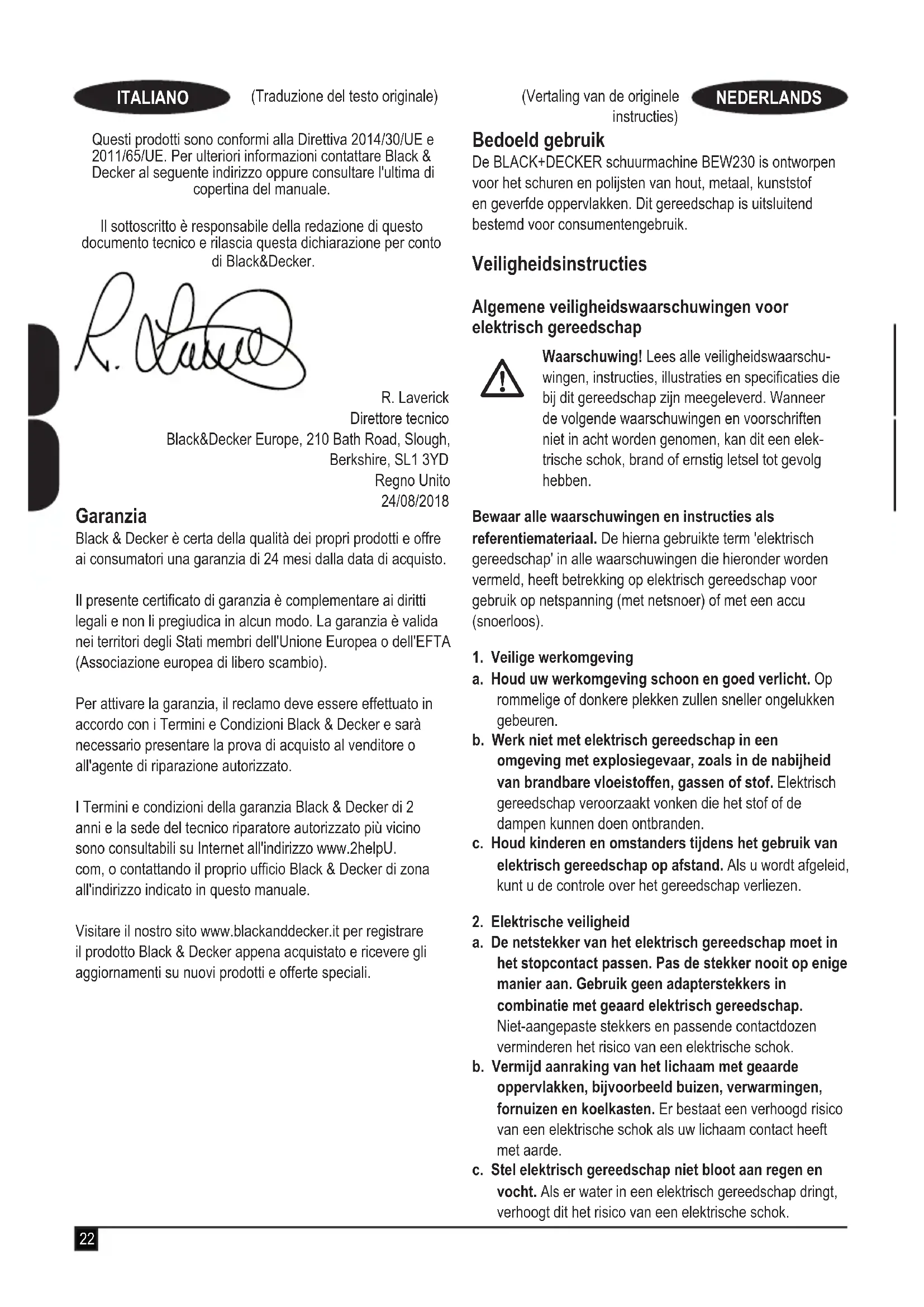 BEW230 Schuurmachine Black & Decker verklaart hierbij dat de producten die worden beschreven onder “technische gegevens”, voldoen aan: 2006/42/EC, EN62841-1:2015, EN62841-2-4:2014. Deze producten voldoen tevens aan richtlijn 2014/30/EU en 2011/65/EU. Neem voor meer informatie contact op met Black & Decker op het volgende adres of raadpleeg de achterzijde van de handleiding. Ondergetekende is verantwoordelijk voor de samenstelling van het technische bestand en legt deze verklaring af namens Black & Decker. R. Laverick Technisch Directeur Black & Decker Europe, 210 Bath Road, Slough, Berkshire, SL1 3YD Verenigd Koninkrijk 24-8-2018 Garantie Black & Decker heeft vertrouwen in zijn producten en biedt consumenten een garantie van 24 maanden vanaf de aankoopdatum. Deze garantie vormt een aanvulling op uw wettelijke rechten en beperken deze niet. De garantie is geldig op het grondgebied van de Lidstaten van de Europese Unie en de Europese Vrijhandelszone. Voor een garantie-aanspraak moet uw aanspraak in overeenstemming zijn met de Voorwaarden en Condities van Black & Decker en moet u een bewijs van aankoop overleggen aan de verkoper of aan een geautoriseerde reparatiemonteur. Voorwaarden en condities van de 2-jarige garantie van Black & Decker en het adres van de vestiging van het geautoriseerde reparatiecentrum bij u in de buurt, kunt u vinden op internet op www.2helpU.com, of door contact op te nemen met het Black & Decker-kantoor ter plaatse, op het adres dat in deze handleiding wordt vermeld. Bezoek onze website www.blackanddecker.nl, waar u uw nieuwe Black & Decker-product kunt registreren en het laatste nieuws vindt over nieuwe producten en speciale aanbiedingen. Uso previsto Su lijadora BLACK+DECKER BEW230 ha sido diseñada para lijar y pulir madera, metales, plástico y supercies pintadas. Esta herramienta ha sido concebida únicamente para uso doméstico. Instrucciones de seguridad Advertencias de seguridad generales para herramientas eléctricas