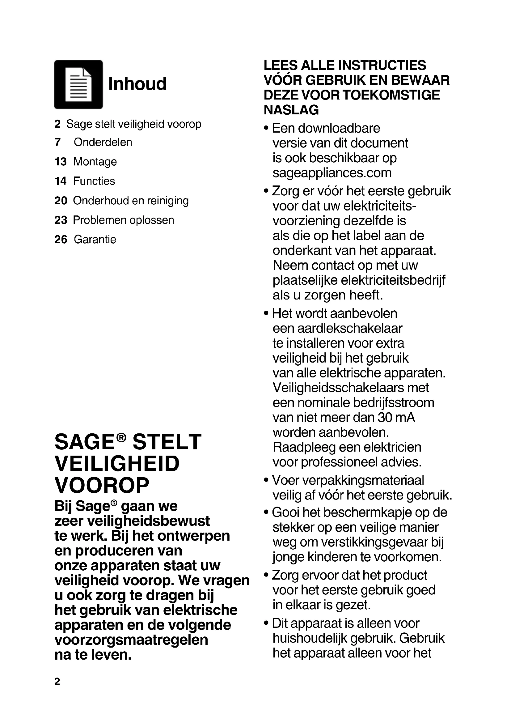gaan we zeer veiligheidsbewust te werk. Bij het ontwerpen en produceren van onze apparaten staat uw veiligheid voorop. We vragen u ook zorg te dragen bij het gebruik van elektrische apparaten en de volgende voorzorgsmaatregelen na te leven. Inhoud 2 Sage stelt veiligheid voorop7 Onderdelen13 Montage14 Functies20 Onderhoud en reiniging23 Problemen oplossen26 Garantie3