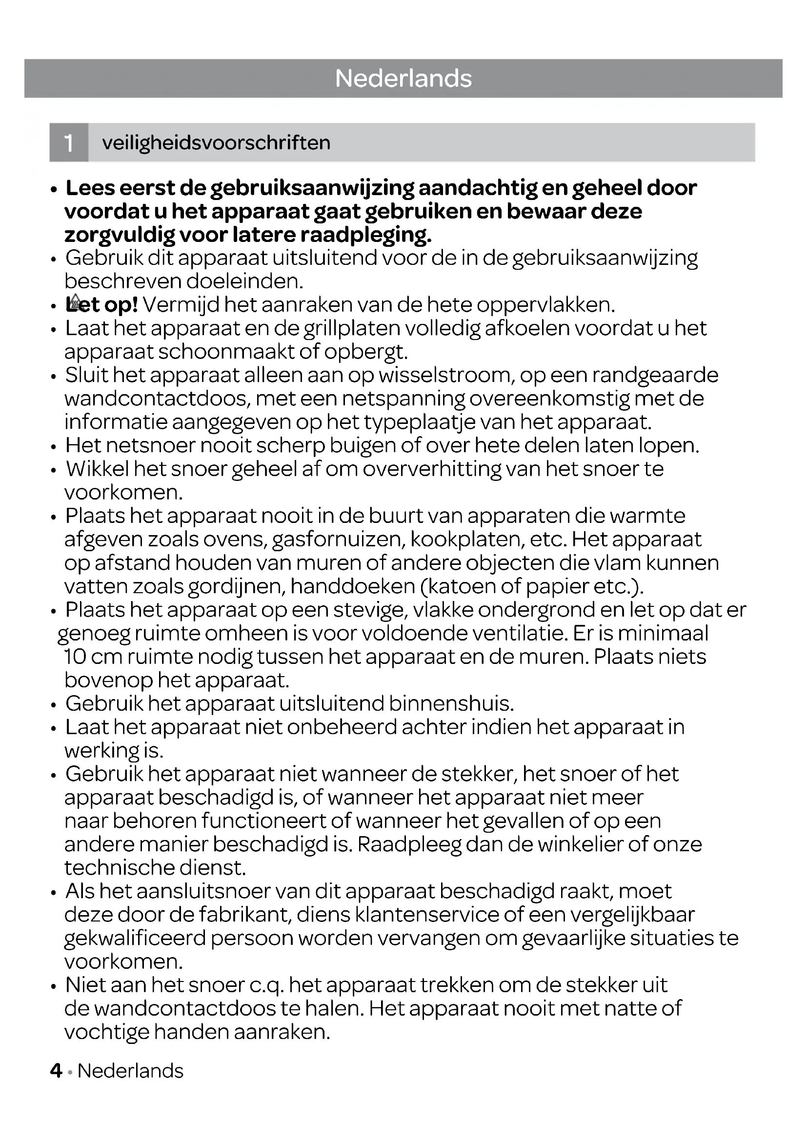 - Niet aan het snoer c.q. het apparaat trekken om de stekker uit de wandcontactdoos te halen. Het apparaat nooit met natte of vochtige handen aanraken.Nederlands • 5