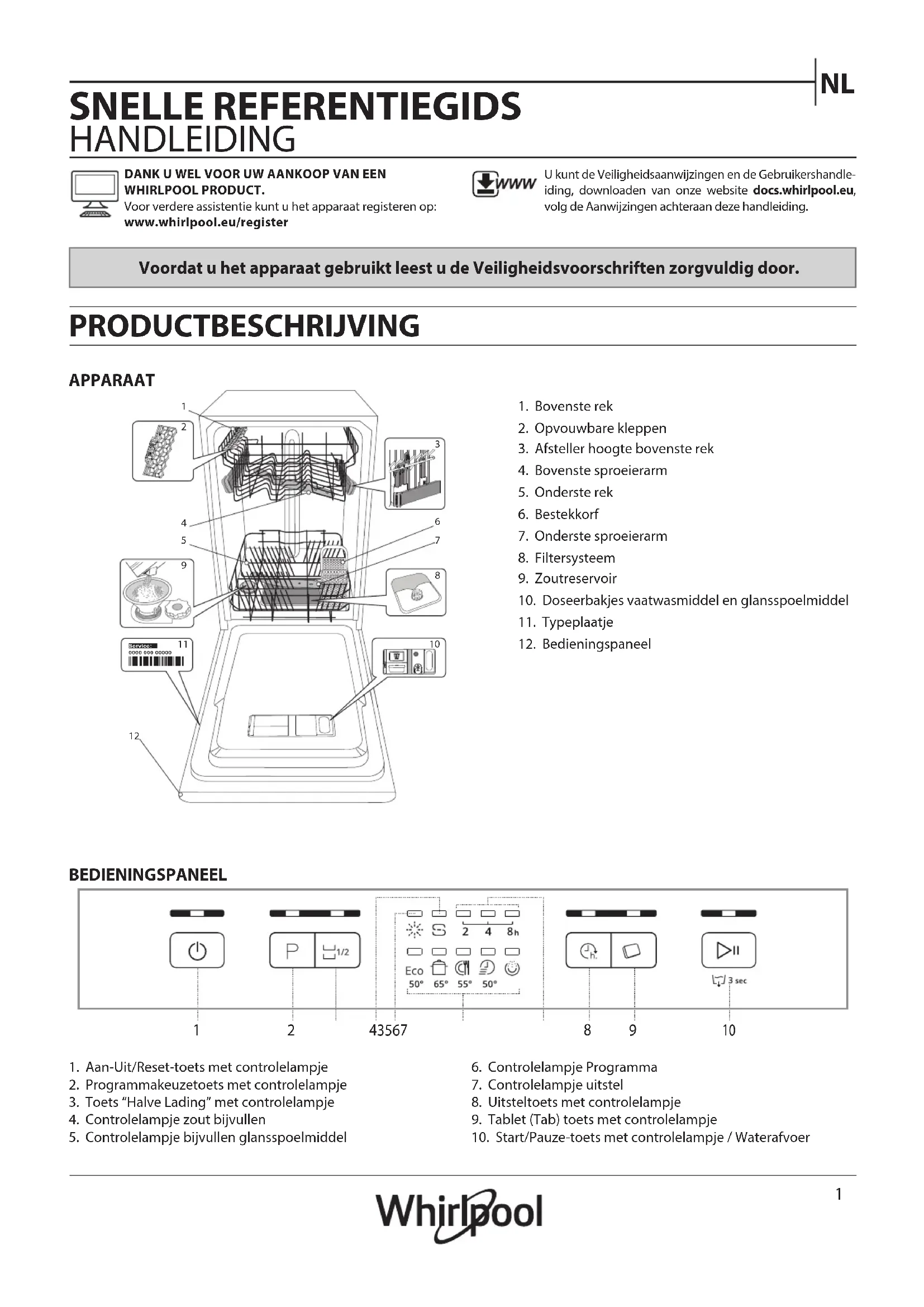 SNELLE REFERENTIEGIDS HANDLEIDING PRODUCTBESCHRIJVING APPARAAT BEDIENINGSPANEEL Voordat u het apparaat gebruikt leest u de Veiligheidsvoorschriften zorgvuldig door. DANK U WEL VOOR UW AANKOOP VAN EENWHIRLPOOL PRODUCT. Voor verdere assistentie kunt u het apparaat registeren op:www.whirlpool.eu/registerU kunt de Veiligheidsaanwijzingen en de Gebruikershandle-iding, downloaden van onze website docs.whirlpool.eu, volg de Aanwijzingen achteraan deze handleiding.1. Bovenste rek2. Opvouwbare kleppen3. Afsteller hoogte bovenste rek4. Bovenste sproeierarm5. Onderste rek6. Bestekkorf7. Onderste sproeierarm8. Filtersysteem9. Zoutreservoir10. Doseerbakjes vaatwasmiddel en glansspoelmiddel11. Typeplaatje12. Bedieningspaneel1. Aan-Uit/Reset-toets met controlelampje2. Programmakeuzetoets met controlelampje3. Toets “Halve Lading” met controlelampje4. Controlelampje zout bijvullen5. Controlelampje bijvullen glansspoelmiddel6. Controlelampje Programma7. Controlelampje uitstel8. Uitsteltoets met controlelampje9. Tablet (Tab) toets met controlelampje10. Start/Pauze-toets met controlelampje / Waterafvoer