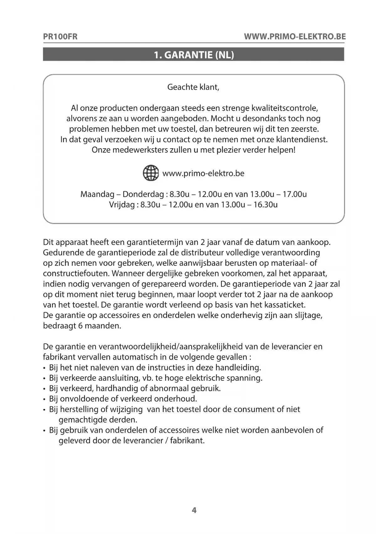 Geachte klant, Al onze producten ondergaan steeds een strenge kwaliteitscontrole, alvorens ze aan u worden aangeboden. Mocht u desondanks toch nog problemen hebben met uw toestel, dan betreuren wij dit ten zeerste. In dat geval verzoeken wij u contact op te nemen met onze klantendienst. Onze medewerksters zullen u met plezier verder helpen! www.primo-elektro.be Maandag – Donderdag : 8.30u – 12.00u en van 13.00u – 17.00u Vrijdag : 8.30u – 12.00u en van 13.00u – 16.30u Dit apparaat heeft een garantietermijn van 2 jaar vanaf de datum van aankoop. Gedurende de garantieperiode zal de distributeur volledige verantwoording op zich nemen voor gebreken, welke aanwijsbaar berusten op materiaal- of constructiefouten. Wanneer dergelijke gebreken voorkomen, zal het apparaat, indien nodig vervangen of gerepareerd worden. De garantieperiode van 2 jaar zal op dit moment niet terug beginnen, maar loopt verder tot 2 jaar na de aankoop van het toestel. De garantie wordt verleend op basis van het kassaticket. De garantie op accessoires en onderdelen welke onderhevig zijn aan slijtage, bedraagt 6 maanden. De garantie en verantwoordelijkheid/aansprakelijkheid van de leverancier en fabrikant vervallen automatisch in de volgende gevallen :