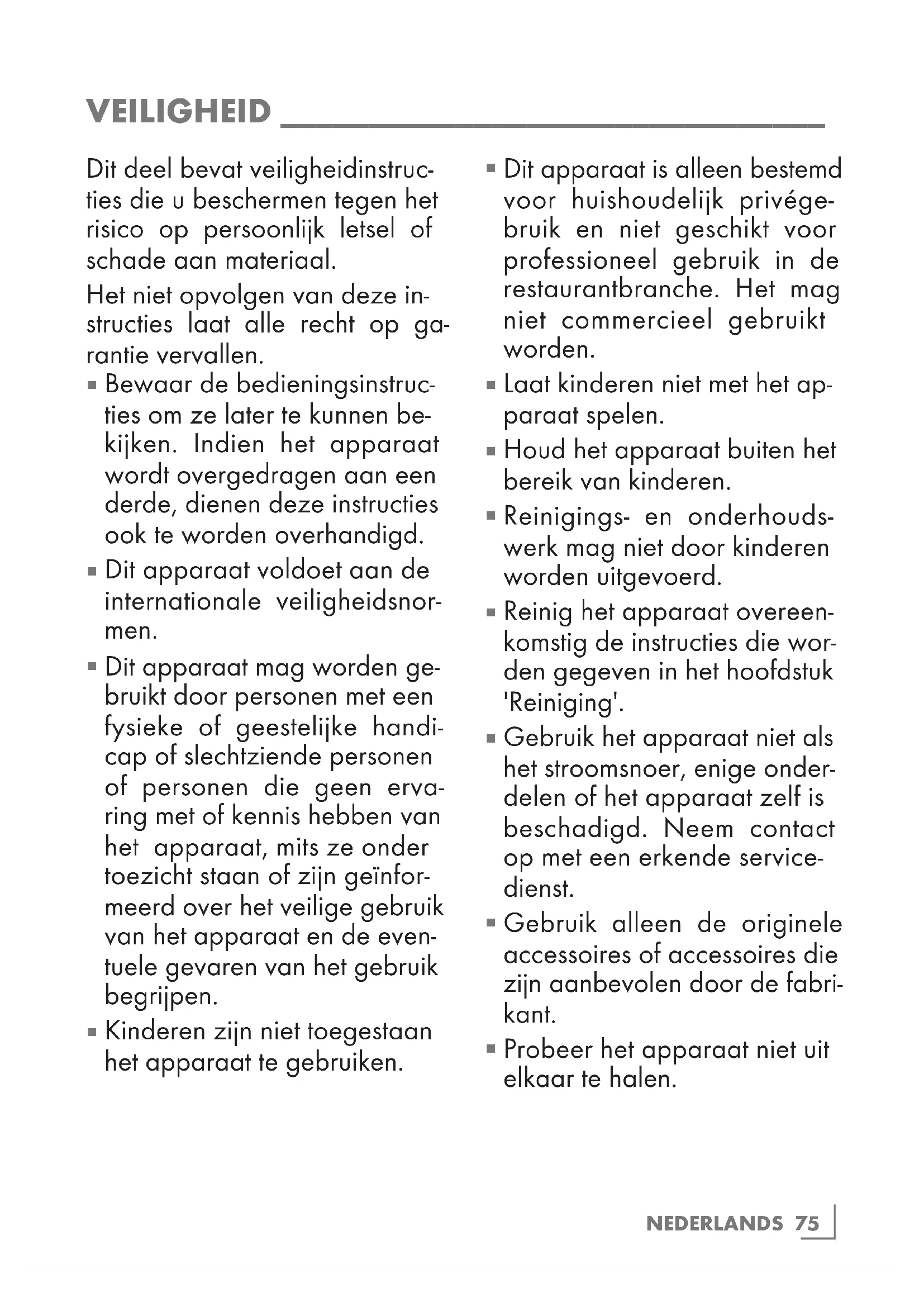 Probeer het apparaat niet uit elkaar te halen. VEILIGHEID _______________________________76 NEDERLANDS