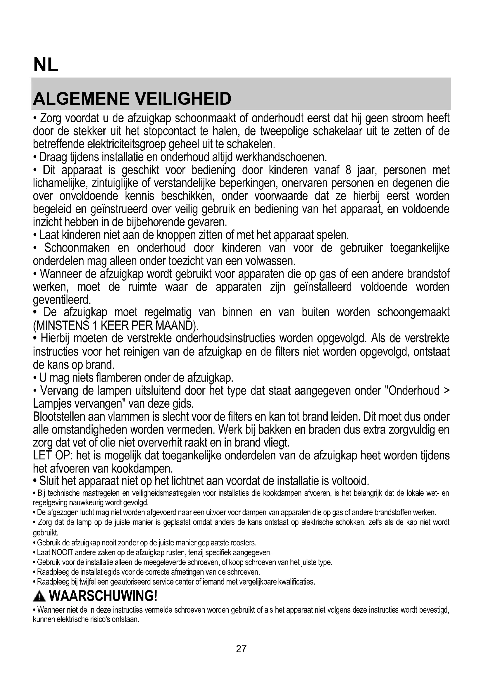 - De afzuigkap moet regelmatig van binnen en van buiten worden schoongemaakt (MINSTENS 1 KEER PER MAAND).