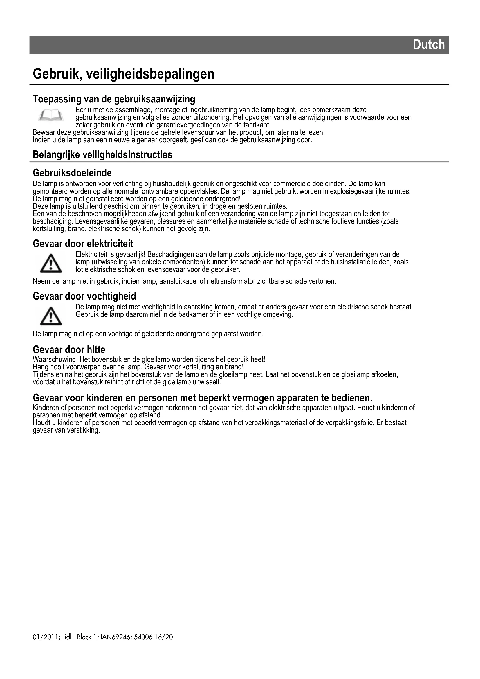 Ingebruikneming Schakel de lamp met de daarvoor toegedachte schakelaar in of uit. Verwijder het verpakkingsmateriaal Verwijder de verpakking per soort. Inlichtingen krijgt u bij het gemeentebestuur. Houdt kinderen op afstand van het verpakkingsmateriaal en vooral van de verpakkingsfolie. Er bestaat gevaar van verstikking. Beschadiging en foutieve functie In het geval van een foutieve functie of beschadiging, haal de lamp van de elektrische huisinstallatie af. Neem ze niet meer in gebruik. Laat de lamp alleen maar van een speciaalzaak of Servicecentrum repareren. Probeer nooit de lamp zelf te repareren. 01/2011; Lidl - Block 1; IAN69246; 5400617/20Dutch Normaal en zeker gebruik, technische gegevens Normaal en zeker gebruik Het opvolgen van alle aanwijzigingen is voorwaarde voor een zeker gebruik en eventuele garantievergoedingen door de fabrikant. Gebruik de lamp uitsluitend met de aangegeven netspanning. De lamp is geen speelgoed. Houdt kinderen of personen met beperkt vermogen op afstand. Gloeilamp vernieuwen Voor het vernieuwen van de gloeilamp, moet u de zekering van de elektrische huisinstallatie uitschakelen (of verwijderen). De lampkop of de gloeilamp worden tijdens gebruik heet en moeten voor het vernieuwen afkoelen. Gebruik alleen maar de in deze gebruiksaanwijzing aangegeven gloeilampen met het maximaal aangegeven vermogen. 1. Draai de afdekkap aan de zijkant tegen de wijzers van de klok in los en verwijder de rubber schijf (zie afb. pag. 2,Ba).