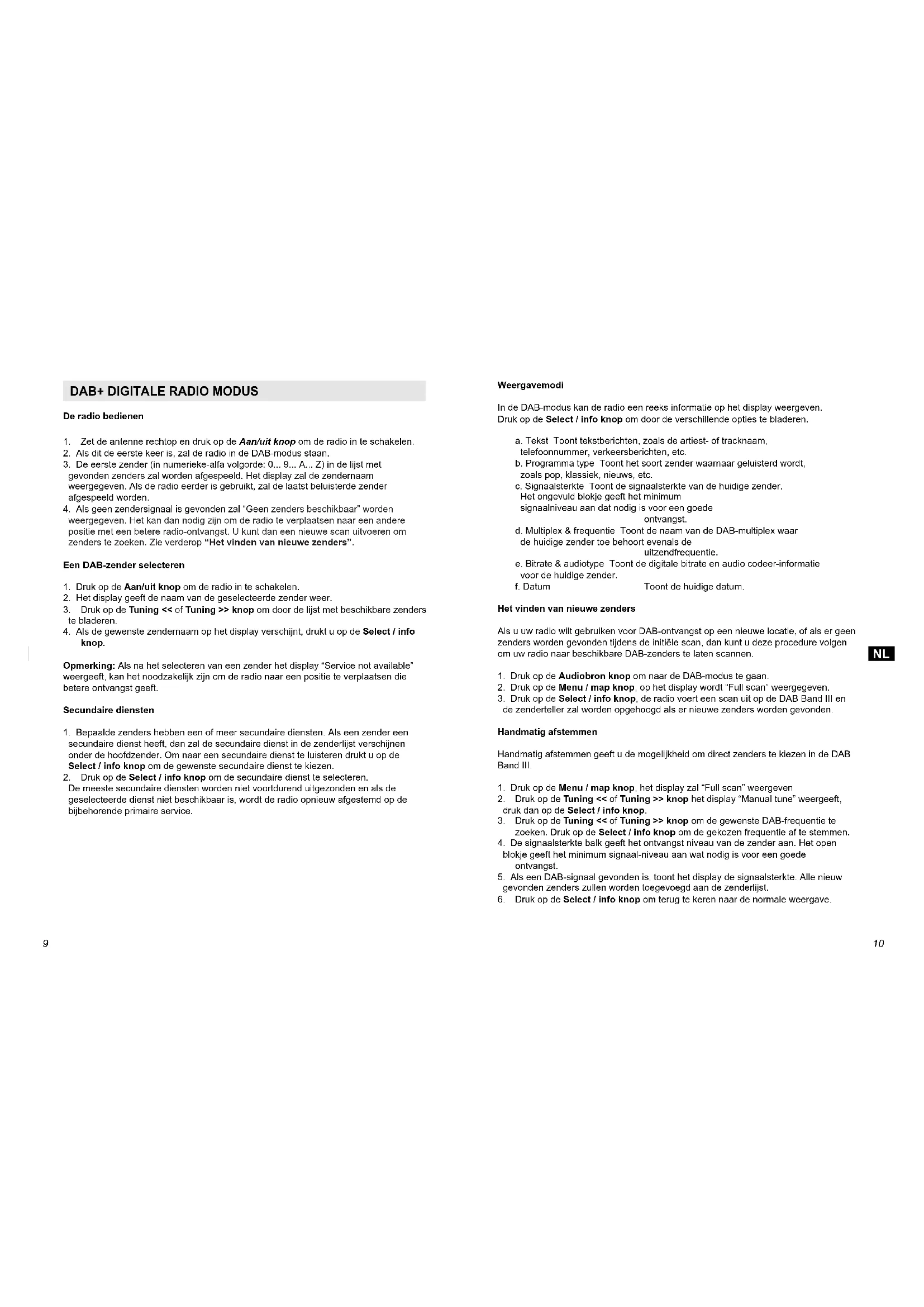 De meeste secundaire diensten worden niet voortdurend uitgezonden en als de geselecteerde dienst niet beschikbaar is, wordt de radio opnieuw afgestemd op de bijbehorende primaire service. Weergavemodi In de DAB-modus kan de radio een reeks informatie op het display weergeven. Druk op de Select / info knop om door de verschillende opties te bladeren. a. Tekst Toont tekstberichten, zoals de artiest- of tracknaam, telefoonnummer, verkeersberichten, etc. b. Programma type Toont het soort zender waarnaar geluisterd wordt, zoals pop, klassiek, nieuws, etc. c. Signaalsterkte Toont de signaalsterkte van de huidige zender. Het ongevuld blokje geeft het minimum signaalniveau aan dat nodig is voor een goede ontvangst. d. Multiplex & frequentie Toont de naam van de DAB-multiplex waar de huidige zender toe behoort evenals de uitzendfrequentie. e. Bitrate & audiotype Toont de digitale bitrate en audio codeer-informatie voor de huidige zender. f. Datum Toont de huidige datum. Het vinden van nieuwe zenders Als u uw radio wilt gebruiken voor DAB-ontvangst op een nieuwe locatie, of als er geen zenders worden gevonden tijdens de initiële scan, dan kunt u deze procedure volgen om uw radio naar beschikbare DAB-zenders te laten scannen.