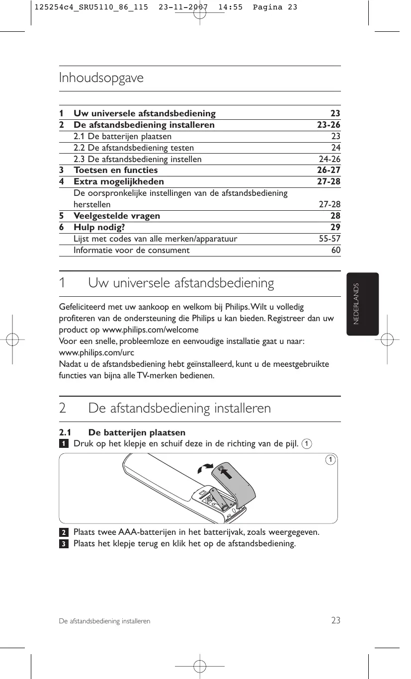 Uw universele afstandsbediening Gefeliciteerd met uw aankoop en welkom bij Philips.Wilt u volledig profiteren van de ondersteuning die Philips u kan bieden. Registreer dan uw product op www.philips.com/welcome Voor een snelle, probleemloze en eenvoudige installatie gaat u naar: www.philips.com/urc Nadat u de afstandsbediening hebt geïnstalleerd, kunt u de meestgebruikte functies van bijna alle TV-merken bedienen.