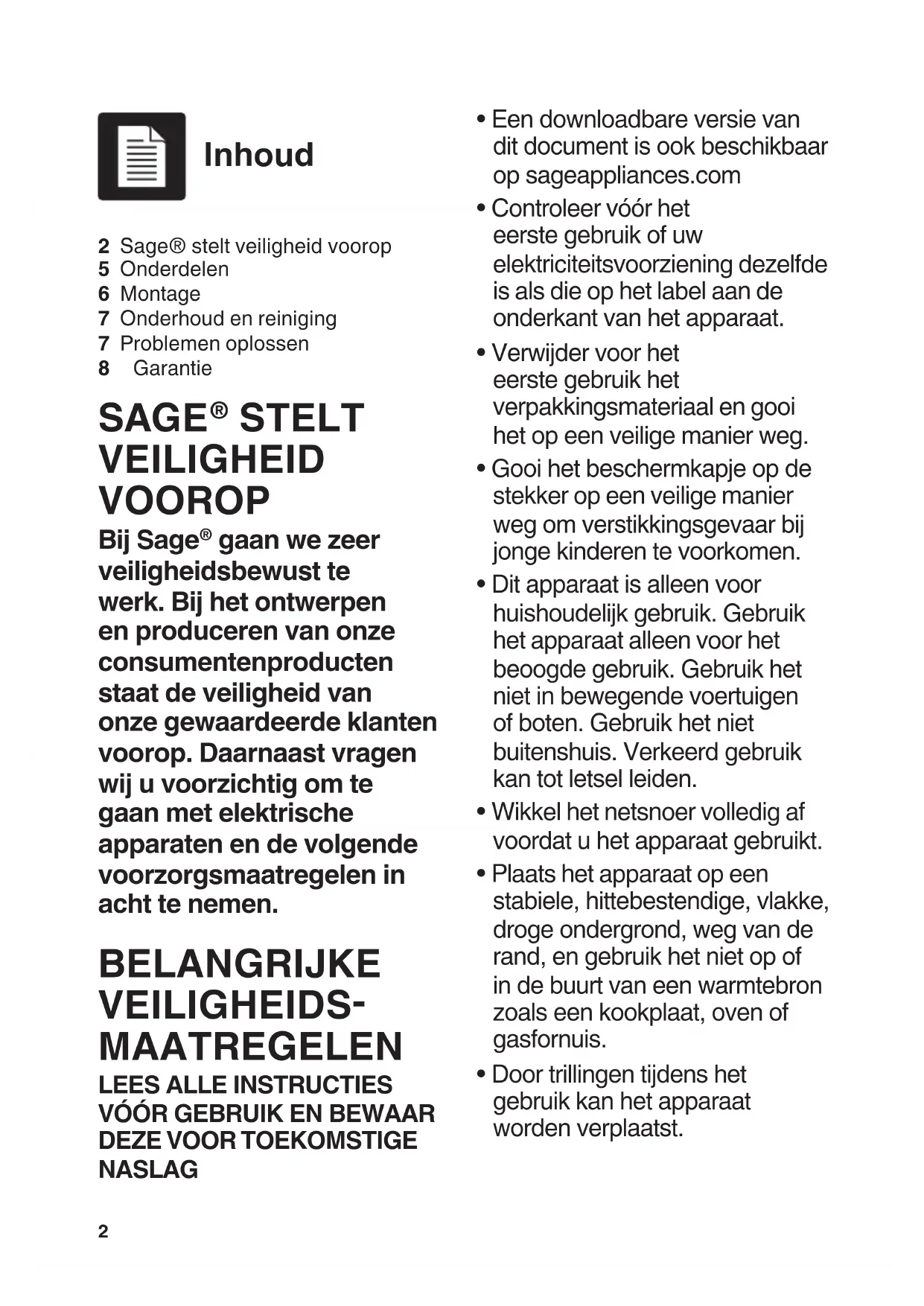 NASLAG 2 Sage® stelt veiligheid voorop 5 Onderdelen6 Montage7 Onderhoud en reiniging7 Problemen oplossen8 Garantie3