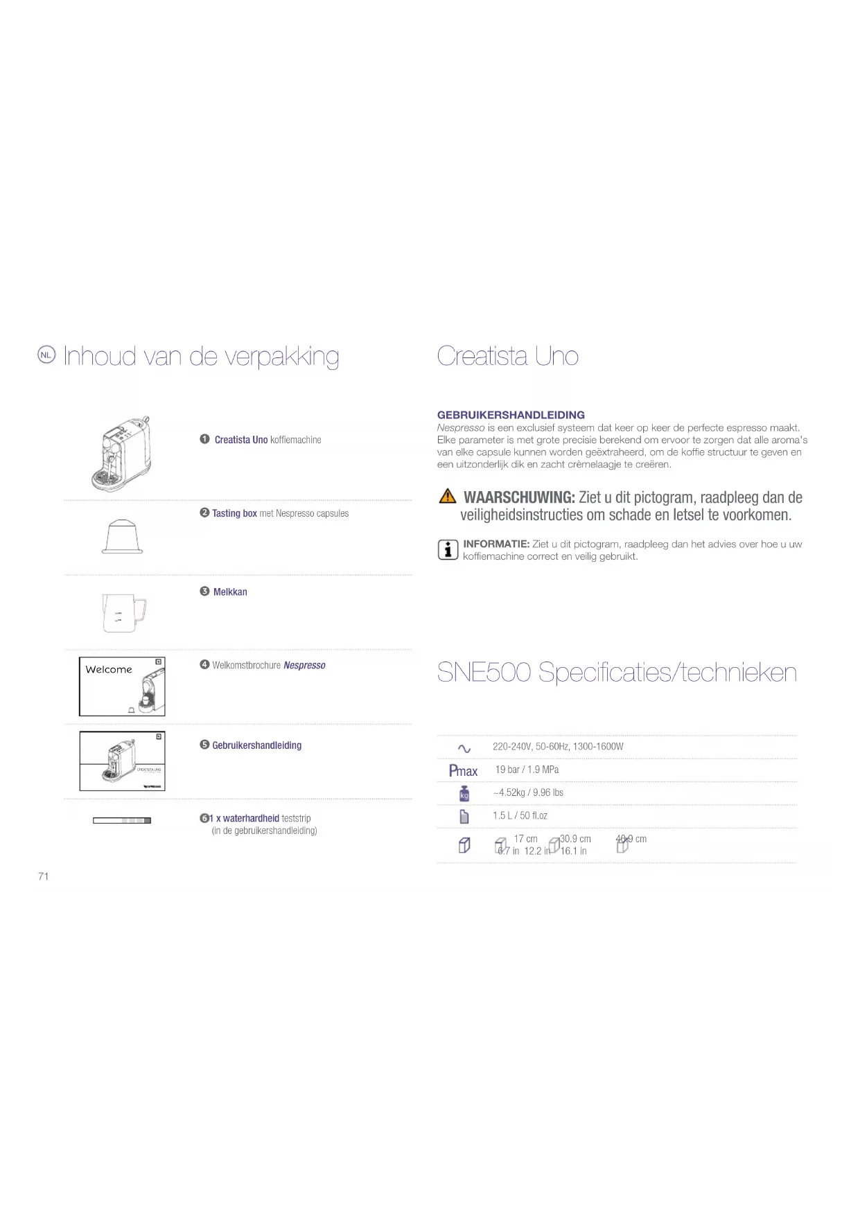 CREATISTA UNOMY MAC HINEWelcome220-240V, 50-60Hz, 1300-1600W max 19 bar / 1.9 MPa~4.52kg / 9.96 lbs1.5 L / 50 fl.oz 17 cm 30.9 cm 40.9 cm 6.7 in 12.2 in 16.1 in GEBRUIKERSHANDLEIDING Nespresso is een exclusief systeem dat keer op keer de perfecte espresso maakt. Elke parameter is met grote precisie berekend om ervoor te zorgen dat alle aroma's van elke capsule kunnen worden geëxtraheerd, om de koffie structuur te geven en een uitzonderlijk dik en zacht crèmelaagje te creëren. WAARSCHUWING: Ziet u dit pictogram, raadpleeg dan de veiligheidsinstructies om schade en letsel te voorkomen. INFORMATIE: Ziet u dit pictogram, raadpleeg dan het advies over hoe u uw koffiemachine correct en veilig gebruikt. Inhoud van de verpakking ❷ Tasting box met Nespresso capsules ❹ Welkomstbrochure Nespresso MAX MIN ❸ Melkkan ❺ Gebruikershandleiding 1 x waterhardheid teststrip (in de gebruikershandleiding) ❶ Creatista Uno koffiemachine Creatista Uno SNE500 Specificaties/technieken72