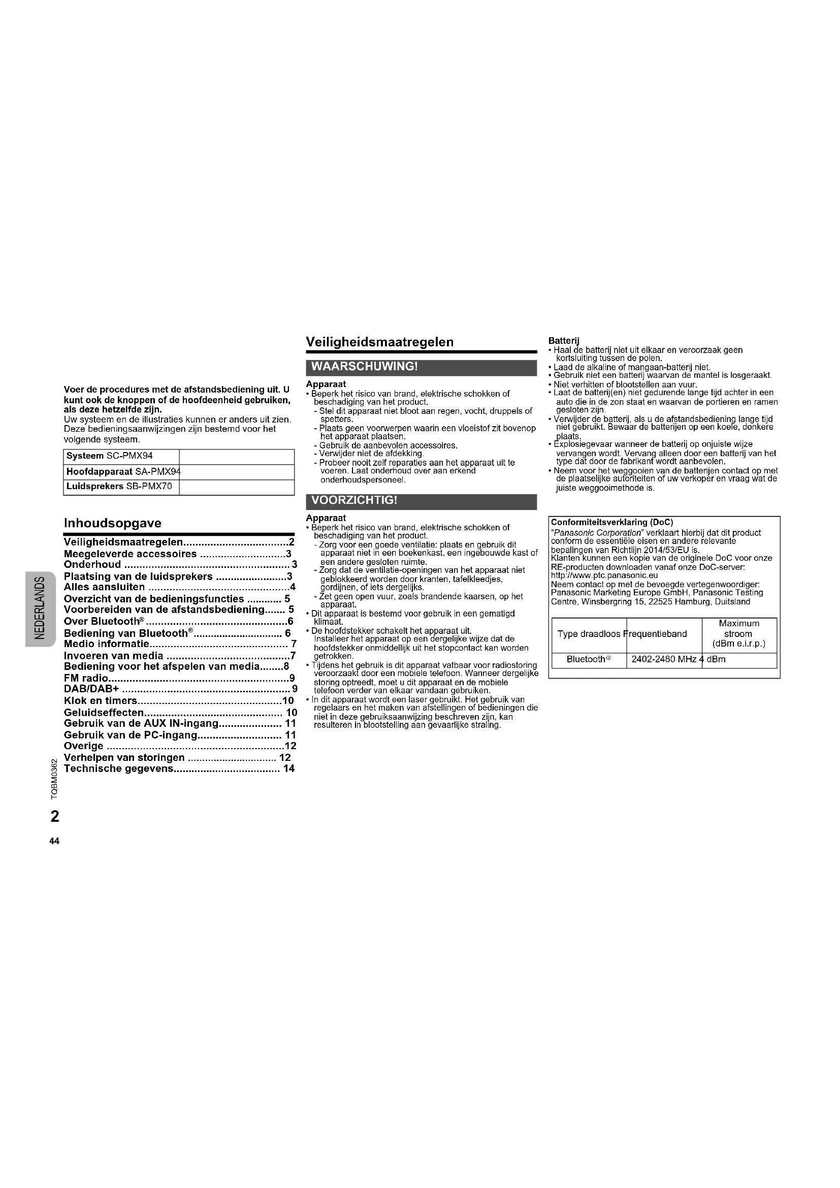 - Haal de batterij niet uit elkaar en veroorzaak geen kortsluiting tussen de polen.• Laad de alkaline of mangaan-batterij niet.• Gebruik niet een batterij waarvan de mantel is losgeraakt.• Niet verhitten of blootstellen aan vuur.• Laat de batterij(en) niet gedurende lange tijd achter in een auto die in de zon staat en waarvan de portieren en ramen gesloten zijn.• Verwijder de batterij, als u de afstandsbediening lange tijd niet gebruikt. Bewaar de batterijen op een koele, donkere plaats.• Explosiegevaar wanneer de batterij op onjuiste wijze vervangen wordt. Vervang alleen door een batterij van het type dat door de fabrikant wordt aanbevolen.• Neem voor het weggooien van de batterijen contact op met de plaatselijke autoriteiten of uw verkoper en vraag wat de juiste weggooimethode is. Systeem SC-PMX94 Hoofdapparaat SA-PMX94 Luidsprekers SB-PMX70 WAARSCHUWING! VOORZICHTIG! Conformiteitsverklaring (DoC)“Panasonic Corporation” verklaart hierbij dat dit product conform de essentiële eisen en andere relevante bepalingen van Richtlijn 2014/53/EU is.Klanten kunnen een kopie van de originele DoC voor onze RE-producten downloaden vanaf onze DoC-server:http://www.ptc.panasonic.euNeem contact op met de bevoegde vertegenwoordiger:Panasonic Marketing Europe GmbH, Panasonic Testing Centre, Winsbergring 15, 22525 Hamburg, Duitsland Type draadloos Frequentieband Maximum stroom (dBm e.i.r.p.) Bluetooth