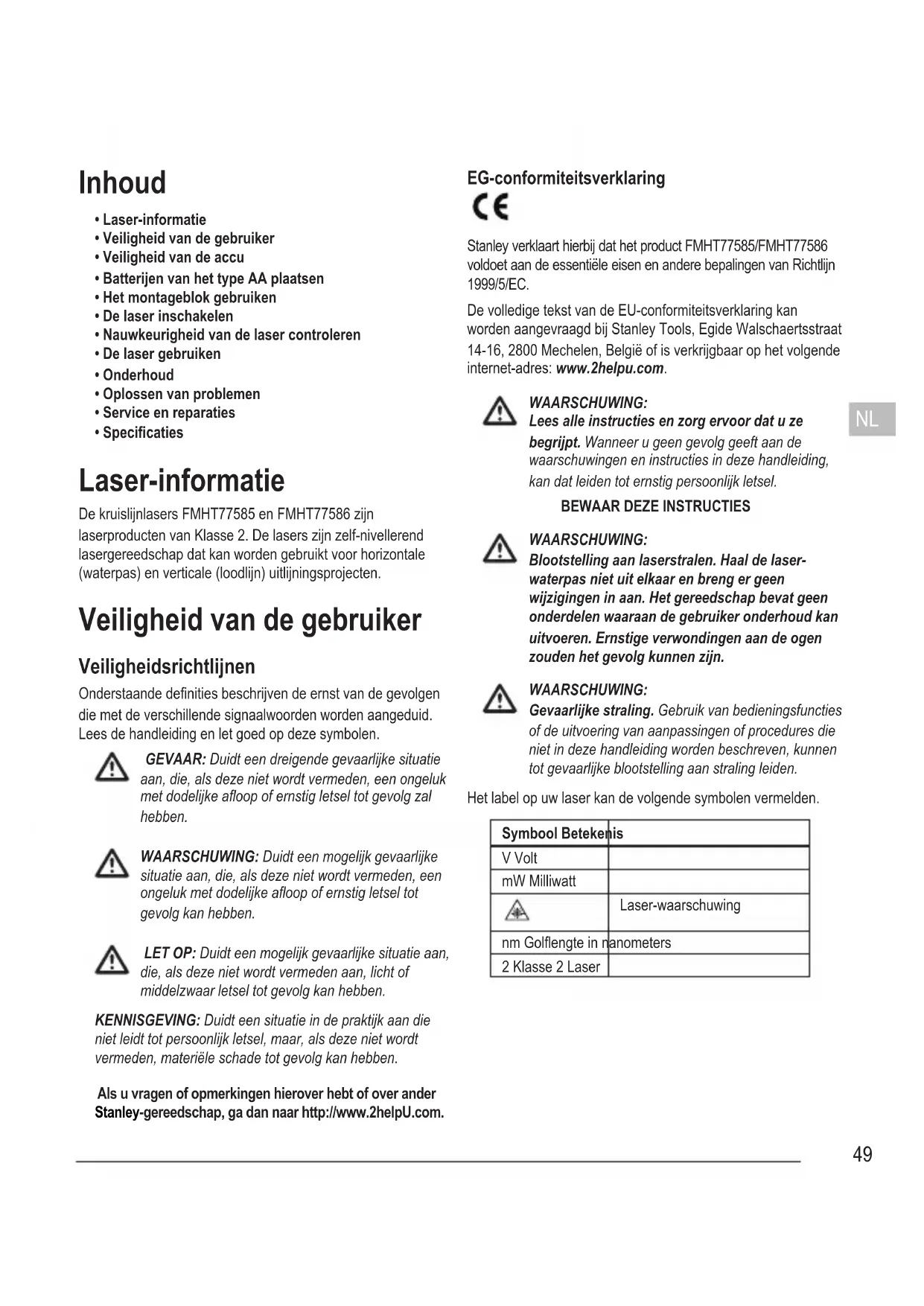 - Specicaties Laser-informatie De kruislijnlasers FMHT77585 en FMHT77586 zijn laserproducten van Klasse 2. De lasers zijn zelf-nivellerend lasergereedschap dat kan worden gebruikt voor horizontale (waterpas) en verticale (loodlijn) uitlijningsprojecten. Veiligheid van de gebruiker Veiligheidsrichtlijnen Onderstaande denities beschrijven de ernst van de gevolgen die met de verschillende signaalwoorden worden aangeduid. Lees de handleiding en let goed op deze symbolen. GEVAAR: Duidt een dreigende gevaarlijke situatie aan, die, als deze niet wordt vermeden, een ongeluk met dodelijke aoop of ernstig letsel tot gevolg zal hebben. WAARSCHUWING: Duidt een mogelijk gevaarlijke situatie aan, die, als deze niet wordt vermeden, een ongeluk met dodelijke aoop of ernstig letsel tot gevolg kan hebben. LET OP: Duidt een mogelijk gevaarlijke situatie aan, die, als deze niet wordt vermeden aan, licht of middelzwaar letsel tot gevolg kan hebben. KENNISGEVING: Duidt een situatie in de praktijk aan die niet leidt tot persoonlijk letsel, maar, als deze niet wordt vermeden, materiële schade tot gevolg kan hebben. Als u vragen of opmerkingen hierover hebt of over ander Stanley-gereedschap, ga dan naar http://www.2helpU.com. EG-conformiteitsverklaring Stanley verklaart hierbij dat het product FMHT77585/FMHT77586 voldoet aan de essentiële eisen en andere bepalingen van Richtlijn 1999/5/EC. De volledige tekst van de EU-conformiteitsverklaring kan worden aangevraagd bij Stanley Tools, Egide Walschaertsstraat 14-16, 2800 Mechelen, België of is verkrijgbaar op het volgende internet-adres: www.2helpu.com. WAARSCHUWING: Lees alle instructies en zorg ervoor dat u ze begrijpt. Wanneer u geen gevolg geeft aan de waarschuwingen en instructies in deze handleiding, kan dat leiden tot ernstig persoonlijk letsel.