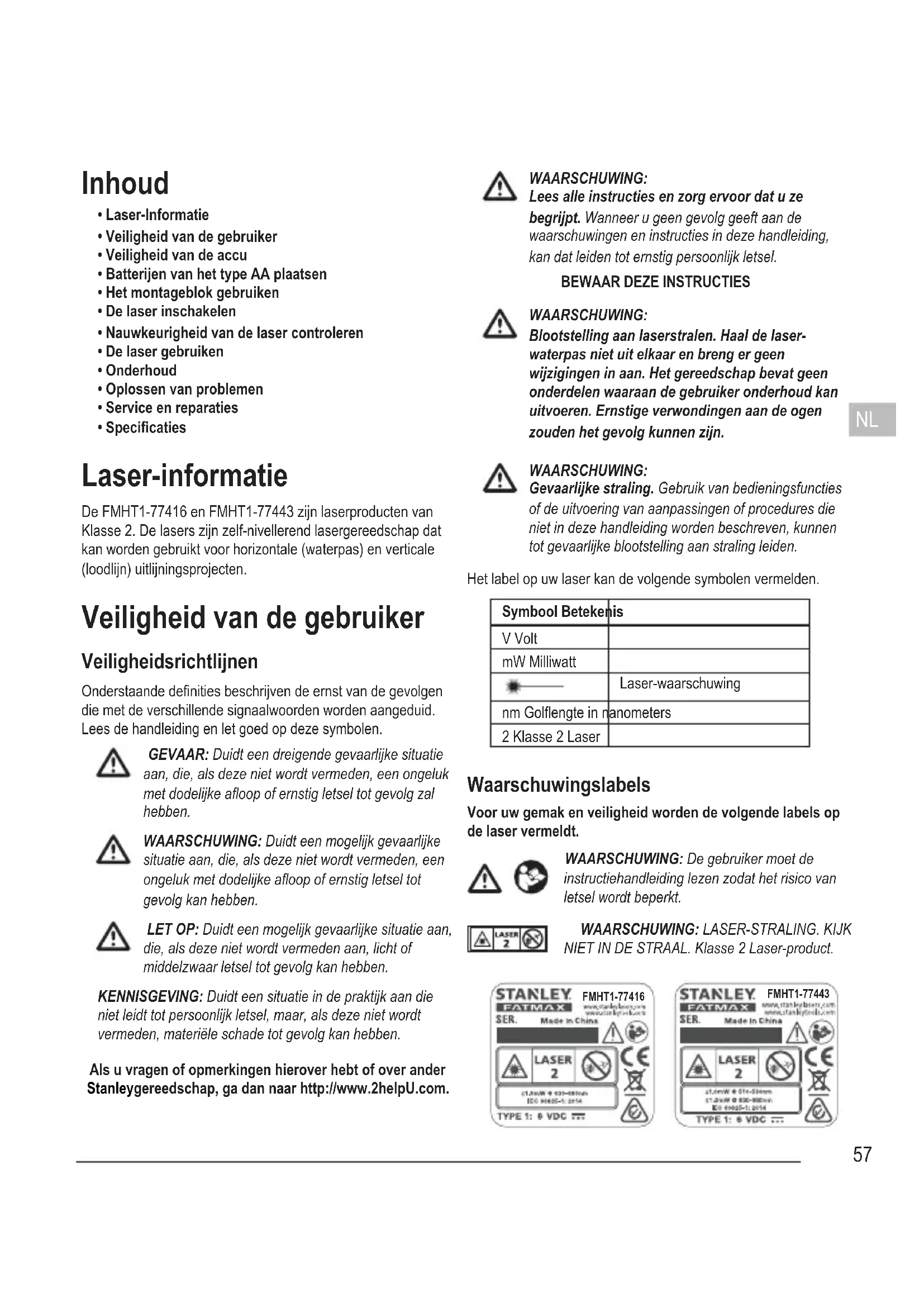 - Specicaties Laser-informatie De FMHT1-77416 en FMHT1-77443 zijn laserproducten van Klasse 2. De lasers zijn zelf-nivellerend lasergereedschap dat kan worden gebruikt voor horizontale (waterpas) en verticale (loodlijn) uitlijningsprojecten. Veiligheid van de gebruiker Veiligheidsrichtlijnen Onderstaande denities beschrijven de ernst van de gevolgen die met de verschillende signaalwoorden worden aangeduid. Lees de handleiding en let goed op deze symbolen. GEVAAR: Duidt een dreigende gevaarlijke situatie aan, die, als deze niet wordt vermeden, een ongeluk met dodelijke aoop of ernstig letsel tot gevolg zal hebben. WAARSCHUWING: Duidt een mogelijk gevaarlijke situatie aan, die, als deze niet wordt vermeden, een ongeluk met dodelijke aoop of ernstig letsel tot gevolg kan hebben. LET OP: Duidt een mogelijk gevaarlijke situatie aan, die, als deze niet wordt vermeden aan, licht of middelzwaar letsel tot gevolg kan hebben. KENNISGEVING: Duidt een situatie in de praktijk aan die niet leidt tot persoonlijk letsel, maar, als deze niet wordt vermeden, materiële schade tot gevolg kan hebben. Als u vragen of opmerkingen hierover hebt of over ander Stanleygereedschap, ga dan naar http://www.2helpU.com. WAARSCHUWING: Lees alle instructies en zorg ervoor dat u ze begrijpt. Wanneer u geen gevolg geeft aan de waarschuwingen en instructies in deze handleiding, kan dat leiden tot ernstig persoonlijk letsel.