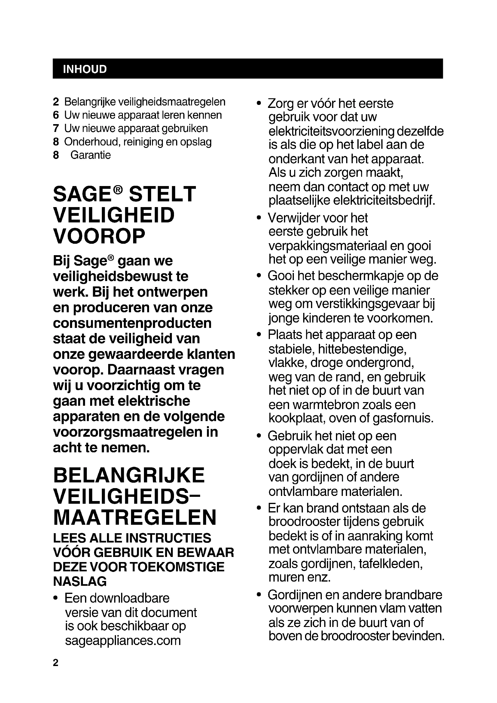 Bij Sage® gaan we visiligheidsbewust te werk. Bij het ontwerpen en produceren van once consumptenproducten staat de visiligheid van once gewaardeerde klanten voorop. Daarnaast vragen wij u voorzichtig om te gaan met elektrische apparaten en de volgende voorzorgsmaatregelen in acht te nemen.