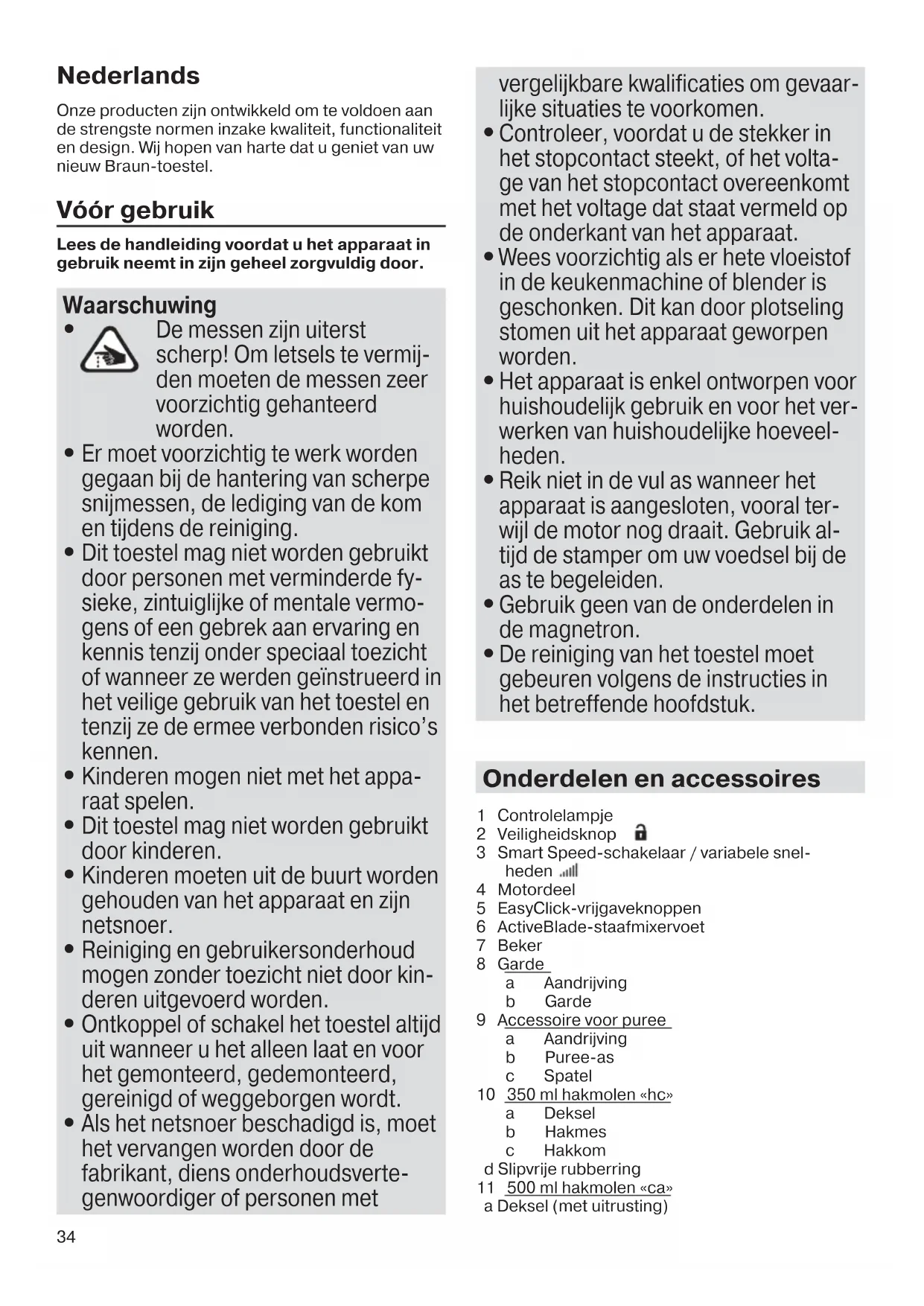 - Indien u het toestel gebruikt om puree te maken van warm eten in een pan haal de pan dan van het vuur en let erop dat de vloeistof niet kookt. Laat warm voedsel licht afkoelen om brandwonden te voorkomen.