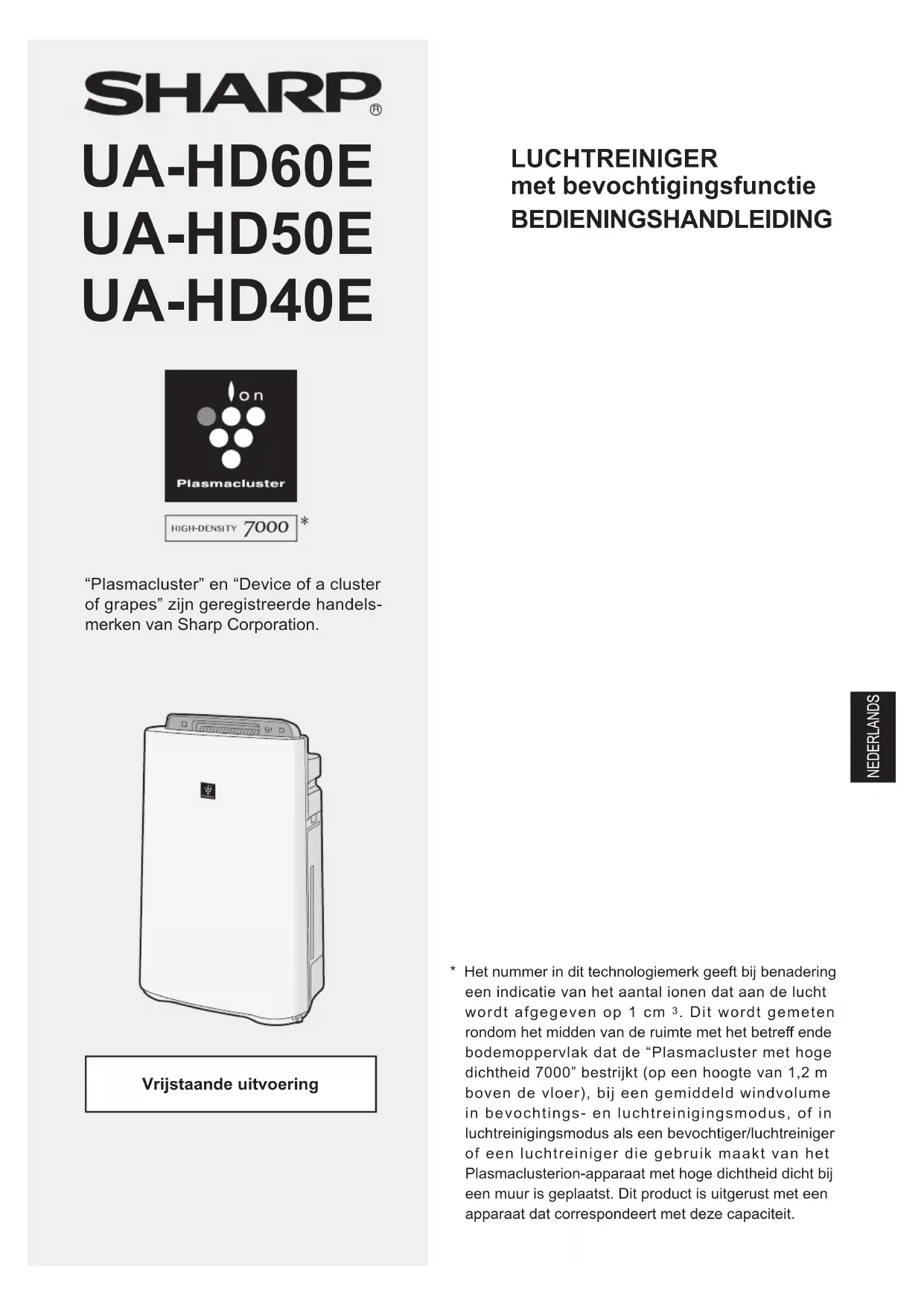 “Plasmacluster” en “Device of a cluster of grapes” zijn geregistreerde handels- merken van Sharp Corporation. UA-HD60E UA-HD50E UA-HD40E LUCHTREINIGER met bevochtigingsfunctie BEDIENINGSHANDLEIDING