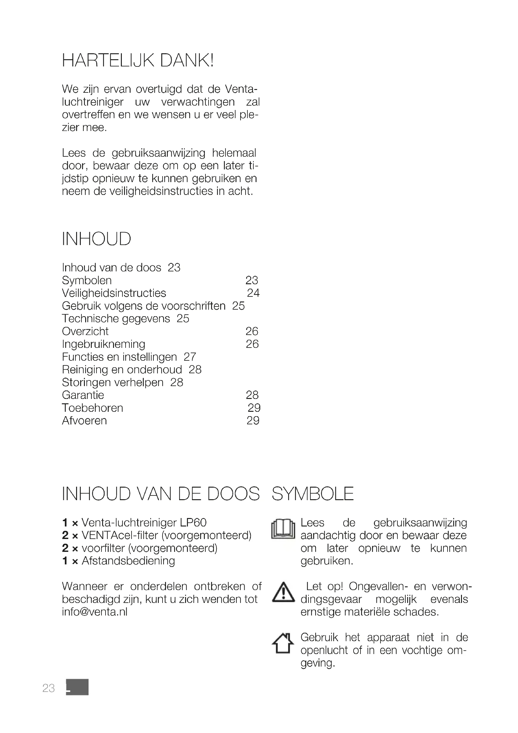 1 × Venta-luchtreiniger LP60 2 × VENTAcel-lter (voorgemonteerd) 2 × voorlter (voorgemonteerd) 1 × Afstandsbediening Wanneer er onderdelen ontbreken of beschadigd zijn, kunt u zich wenden tot info@venta.nl INHOUD Inhoud van de doos 23 Symbolen 23 Veiligheidsinstructies 24 Gebruik volgens de voorschriften 25 Technische gegevens 25 Overzicht 26 Ingebruikneming 26 Functies en instellingen 27 Reiniging en onderhoud 28 Storingen verhelpen 28 Garantie 28 Toebehoren 29 Afvoeren 2924NLVenta LP60 ∙ Dit apparaat is geschikt voor ge- bruik door kinderen vanaf 8 jaar en personen met beperkte lichamelijke, sensorische of mentale capaciteiten of met een gebrekkige ervaring en kennis, wanneer zij onder toezicht staan of met betrekking tot een veilig gebruik van het apparaat werden ge- instrueerd en de bestaande gevaren hebben begrepen. ∙ Het apparaat is geen speelgoed voor kinderen. ∙ Reiniging en onderhoud door de gebruiker mogen niet worden uitge- voerd door kinderen jonger dan 8 jaar of zonder toezicht. ∙ Houd het apparaat en het stroomka- bel uit de buurt van kinderen jonger dan 8 jaar. ∙ Een ondeskundig gebruik kan het ap- paraat beschadigen en verwondin- gen veroorzaken. ∙ Lees de gebruiksaanwijzing vóór in- gebruikname volledig door en bewaar deze zorgvuldig om later opnieuw te kunnen raadplegen. ∙ Sluit het apparaat alleen aan op ge- schikte stopcontacten – netspanning volgens de gegevens op het type- plaatje van het apparaat. ∙ Trek de stekker uit het stopcontact alvorens reinigings- of onderhouds- werkzaamheden uit te voeren en ook wanneer het apparaat wordt ver- plaatst of getransporteerd. ∙ Neem de luchtreiniger nooit in ge- bruik wanneer het aansluitsnoer be- schadigd is. ∙ Vervangende aansluitsnoeren moe- ten voldoen aan het type “IEC-con- nector 60320 C5”. ∙ Neem de luchtreiniger nooit in ge- bruik wanneer deze is gevallen of op een andere manier werd beschadigd. ∙ Reparaties aan elektrische appara- ten mogen alleen worden uitgevoerd door erkende elektriciens. Door on- vakkundig uitgevoerde reparaties kunnen aanzienlijke gevaren voor de gebruiker ontstaan. ∙ Ga in geen geval op het apparaat zit- ten en leg er geen voorwerpen op. ∙ Steek geen vreemde voorwerpen in het apparaat. ∙ Dompel het apparaat nooit in water of andere vloeistoen. ∙ Trek de stekker nooit aan het snoer en ook niet met natte handen uit het stopcontact. ∙ De luchtreiniger mag alleen in com- pleet gemonteerde toestand in ge- bruik worden genomen. ∙ Plaats de luchtreiniger alleen op een vlakke, droge ondergrond. ∙ Houd ten opzichte van voorwerpen en wanden een minimale afstand aan de zijkant van ten minste 20 cm en aan de bovenkant 50 cm aan. ∙ Zet het apparaat zodanig neer dat het niet kan worden omgestoten en dat er niemand over het apparaat of over het snoer kan struikelen. ∙ Trek de stekker uit het stopcontact wanneer u het apparaat niet gebruikt. ∙ Blokkeer de ventilatiesleuf niet en dek deze ook niet af, om oververhitting/ beschadiging van het apparaat te voorkomen. VEILIGHEIDSINSTRUCTIES25 NL