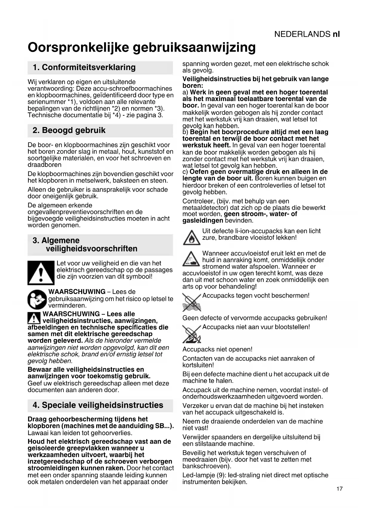 Oorspronkelijke gebruiksaanwijzing Wij verklaren op eigen en uitsluitende verantwoording: Deze accu-schroefboormachines en klopboormachines, geïdentificeerd door type en serienummer *1), voldoen aan alle relevante bepalingen van de richtlijnen *2) en normen *3). Technische documentatie bij *4) - zie pagina 3. De boor- en klopboormachines zijn geschikt voor het boren zonder slag in metaal, hout, kunststof en soortgelijke materialen, en voor het schroeven en draadboren De klopboormachines zijn bovendien geschikt voor het klopboren in metselwerk, baksteen en steen. Alleen de gebruiker is aansprakelijk voor schade door oneigenlijk gebruik. De algemeen erkende ongevallenpreventievoorschriften en de bijgevoegde veiligheidsinstructies moeten in acht worden genomen. Let voor uw veiligheid en die van het elektrisch gereedschap op de passages die zijn voorzien van dit symbool! WAARSCHUWING – Lees de gebruiksaanwijzing om het risico op letsel te verminderen. WAARSCHUWING – Lees alle veiligheidsinstructies, aanwijzingen, afbeeldingen en technische specificaties die samen met dit elektrische gereedschap worden geleverd. Als de hieronder vermelde aanwijzingen niet worden opgevolgd, kan dit een elektrische schok, brand en/of ernstig letsel tot gevolg hebben. Bewaar alle veiligheidsinstructies en aanwijzingen voor toekomstig gebruik. Geef uw elektrisch gereedschap alleen met deze documenten aan anderen door. Draag gehoorbescherming tijdens het klopboren (machines met de aanduiding SB...). Lawaai kan leiden tot gehoorverlies. Houd het elektrisch gereedschap vast aan de geisoleerde greepvlakken wanneer u werkzaamheden uitvoert, waarbij het inzetgereedschap of de schroeven verborgen stroomleidingen kunnen raken. Door het contact met een onder spanning staande leiding kunnen ook metalen onderdelen van het apparaat onder spanning worden gezet, met een elektrische schok als gevolg. Veiligheidsinstructies bij het gebruik van lange boren: a) Werk in geen geval met een hoger toerental als het maximaal toelaatbare toerental van de boor. In geval van een hoger toerental kan de boor makkelijk worden gebogen als hij zonder contact met het werkstuk vrij kan draaien, wat letsel tot gevolg kan hebben. b) Begin het boorprocedure altijd met een laag toerental en terwijl de boor contact met het werkstuk heeft. In geval van een hoger toerental kan de boor makkelijk worden gebogen als hij zonder contact met het werkstuk vrij kan draaien, wat letsel tot gevolg kan hebben. c) Oefen geen overmatige druk en alleen in de lengte van de boor uit. Boren kunnen buigen en hierdoor breken of een controleverlies of letsel tot gevolg hebben. Controleer, (bijv. met behulp van een metaaldetector) dat zich op de plaats die bewerkt moet worden, geen stroom-, water- of gasleidingen bevinden. Uit defecte li-ion-accupacks kan een licht zure, brandbare vloeistof lekken! Wanneer accuvloeistof eruit lekt en met de huid in aanraking komt, onmiddellijk onder stromend water afspoelen. Wanneer er accuvloeistof in uw ogen terecht komt, was deze dan uit met schoon water en zoek onmiddellijk een arts op voor behandeling! Accupacks tegen vocht beschermen! Geen defecte of vervormde accupacks gebruiken! Accupacks niet aan vuur blootstellen! Accupacks niet openen! Contacten van de accupacks niet aanraken of kortsluiten! Bij een defecte machine dient u het accupack uit de machine te halen. Accupack uit de machine nemen, voordat instel- of onderhoudswerkzaamheden uitgevoerd worden. Verzeker u ervan dat de machine bij het insteken van het accupack uitgeschakeld is. Neem de draaiende onderdelen van de machine niet vast! Verwijder spaanders en dergelijke uitsluitend bij een stilstaande machine. Beveilig het werkstuk tegen verschuiven of meedraaien (bijv. door het vast te zetten met bankschroeven). Led-lampje (9): led-straling niet direct met optische instrumenten bekijken.