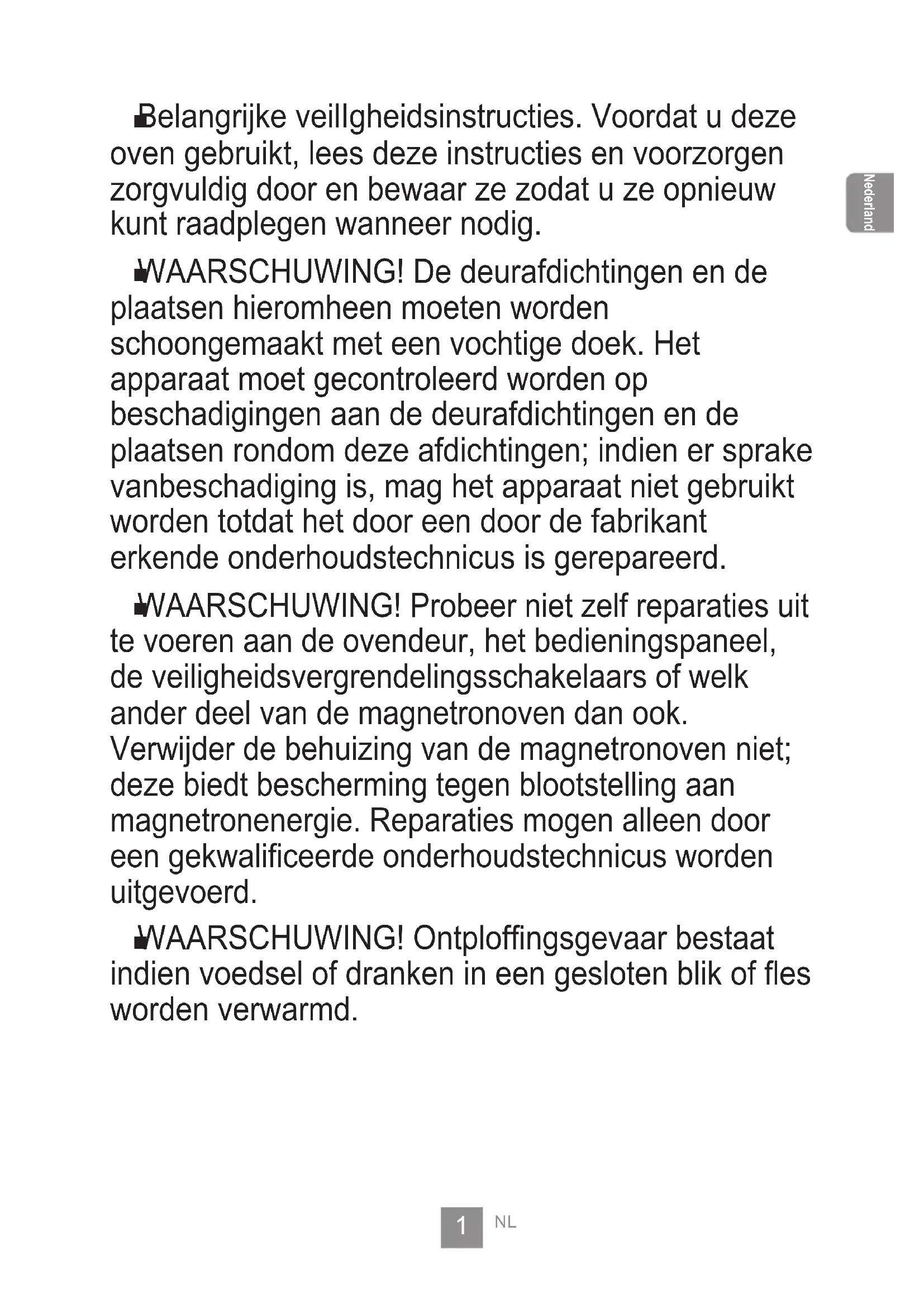 Belangrijke veilIgheidsinstructies. Voordat u deze oven gebruikt, lees deze instructies en voorzorgen zorgvuldig door en bewaar ze zodat u ze opnieuw kunt raadplegen wanneer nodig.