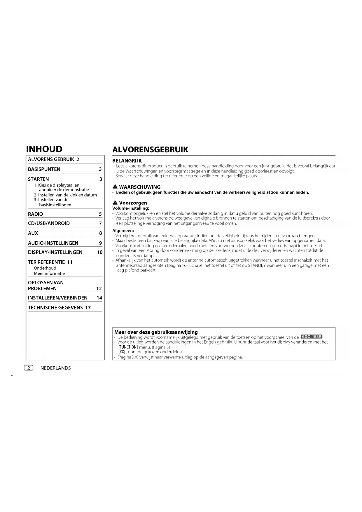AUX 8 AUDIO-INSTELLINGEN 9 DISPLAY-INSTELLINGEN 10 TER REFERENTIE 11 Onderhoud Meer informatie OPLOSSEN VAN PROBLEMEN 12 INSTALLEREN/VERBINDEN 14 TECHNISCHE GEGEVENS 17 Meer over deze gebruiksaanwijzing
