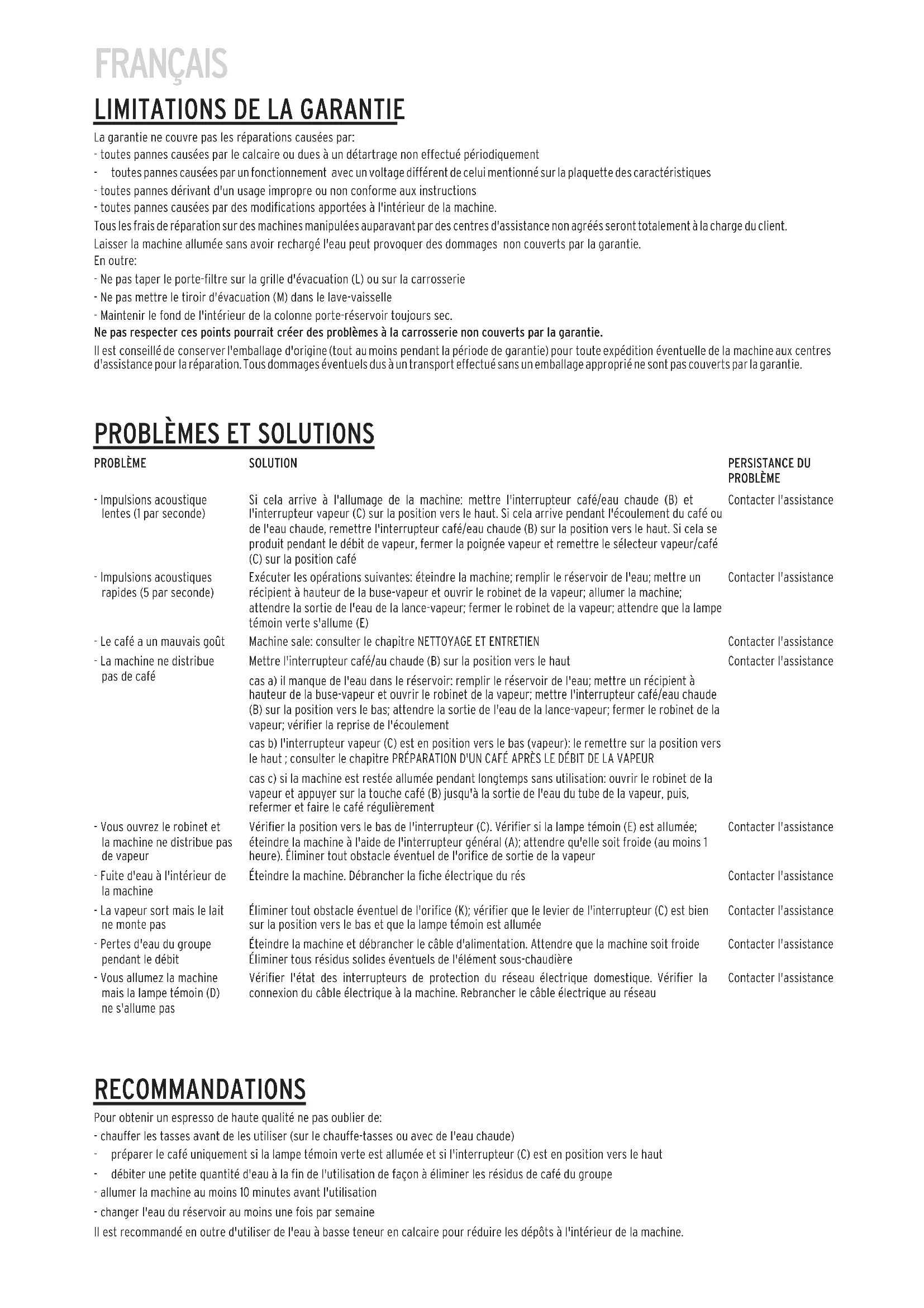 De garantie is niet van toepassing op defecten veroorzaakt door: - kalk of door het niet periodiek ontkalken; - de werking met een ander voltage dan vermeld op het gegevensplaatje van het apparaat - oneigen gebruik of gebruikswijze die de instructies niet respecteren - veranderingen die men zelf binnenin de machine aanbrengt. De reparatiekosten van apparaten die voorheen door niet erkende servicecentra gerepareerd zijn, zijn volledig voor rekening van de klant. Indien de machine aan staat zonder dat de ketel met water gevuld is, kan dit leiden tot schade die niet onder de garantie valt. Bijkomende opmerkingen: - Klop de filterhouder niet op het steunrooster voor de kopjes (L) of op de behuizing leeg - Plaats het afdruipbakje (M) niet in de vaatwasser - Houd steeds de bodem van de binnenkant van de reservoirzuil droog. Indien deze puntjes niet nageleefd worden kan dit leiden tot problemen met de behuizing die niet onder de garantie vallen. Het beste kan de originele verpakking (ten minste tijdens de garantieperiode) bewaard worden zodat de machine eventueel teruggezonden kan worden naar een servicecentrum voor herstelling. Schade veroorzaakt door het transport van de machine zonder geschikte verpakking valt niet onder de garantie. AANBEVELINGEN Volg deze aanbevelingen voor een espresso van topkwaliteit: - kopjes steeds voorverwarmen voor het gebruik (op de kopjesverwarmer of met warm water) - de koffie enkel bereiden wanneer het controlelampje (E) uit is en de schakelaar (C) omhoog staat - een beetje water laten uitlopen na gebruik om koffieresten uit de eenheid te verwijderen - de machine minstens 20 minuten voor het gebruik opstarten; NB: bevestig de filterhouder alvorens u de machine inschakelt - minstens één maal per week het water in het reservoir verversen Denk er ook aan dat u best zacht water gebruikt, om kalkafzettingen binnenin de machine te verminderen. NEDERLANDS