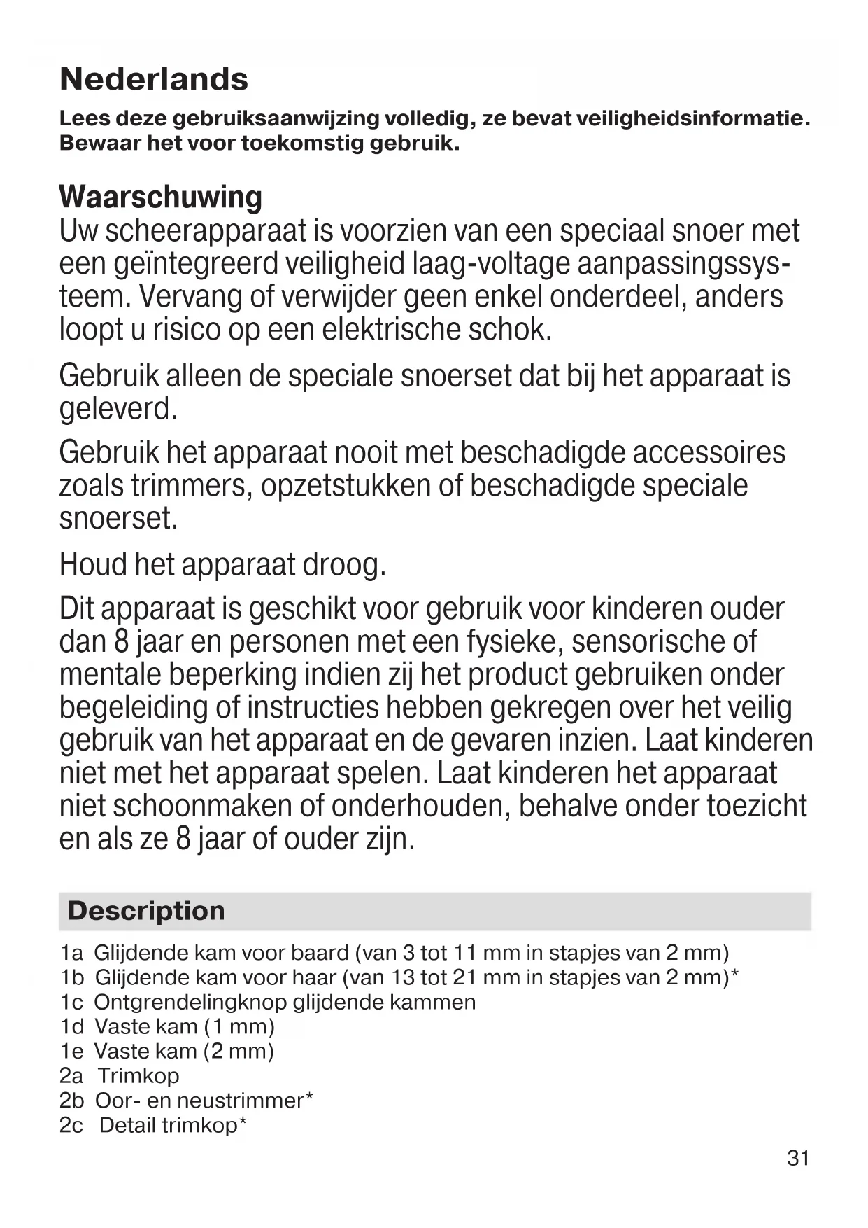 - Zodra het scheerapparaat volledig is opgeladen, gebruik het dan op de normale manier tot het leeg is. Laad het dan weer volledig op. Gebruik Bevestig of verwissel de opzetstukken enkel wanneer het apparaat is uitge- schakeld. Verschuif de aan/uit schakelaar (3) om het apparaat aan te zetten. Baard trimmen / Haar knippen Glijdende kammen (1a, 1b): Plaats één van de kammen op de trimkop (2a). Druk op de ontgrendelingknop (1c) en schuif de kam op gewenste lengte. Vaste kammen (1d, 1e): Plaats één van de kammen op de trimkop (2a).
