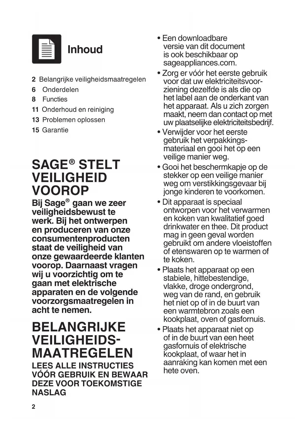 - Een downloadbare versie van dit document is ook beschikbaar op sageappliances.com.