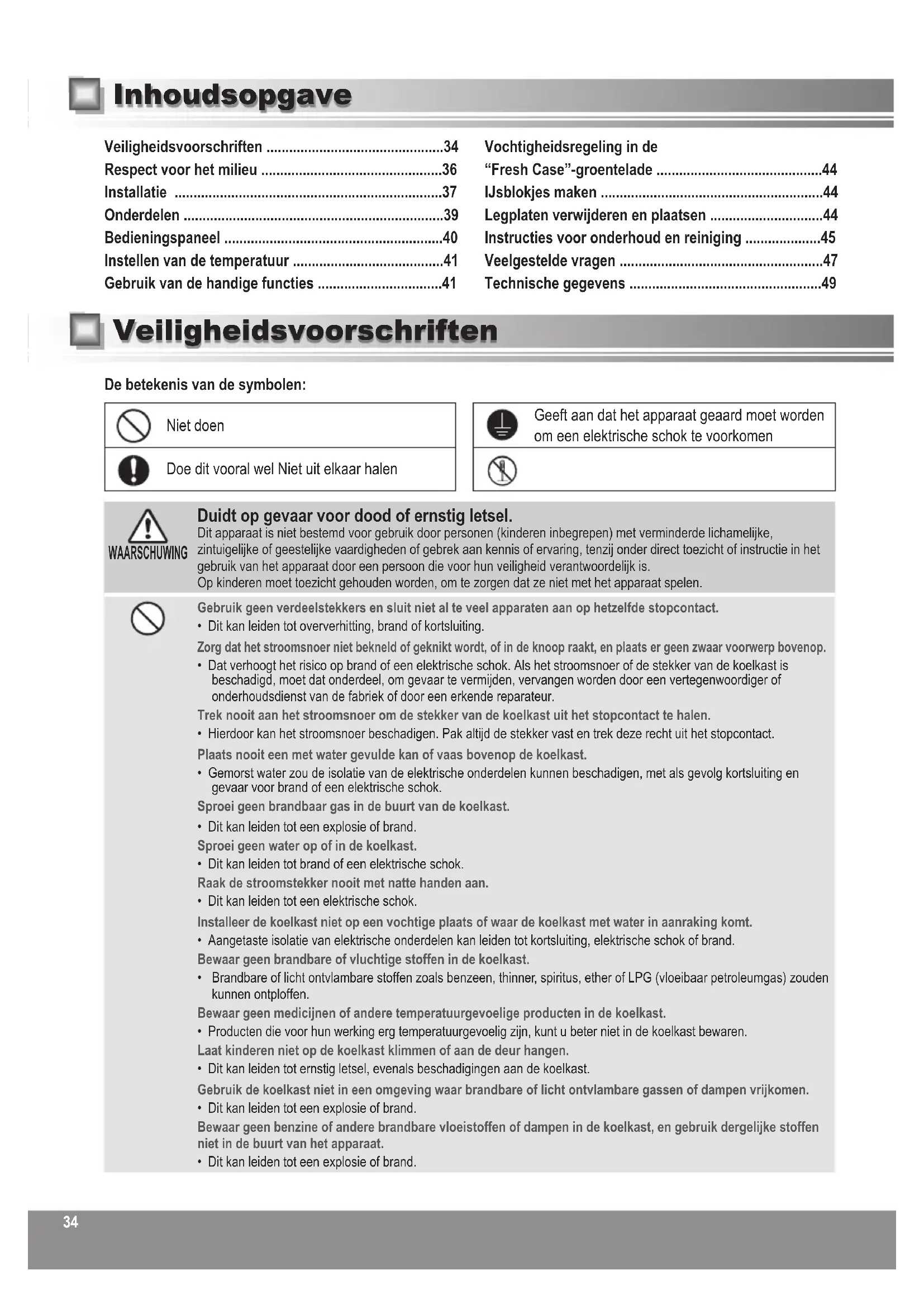 Bewaar geen benzine of andere brandbare vloeistoffen of dampen in de koelkast, en gebruik dergelijkke stoffen nicht in de buurt van het apparatus.