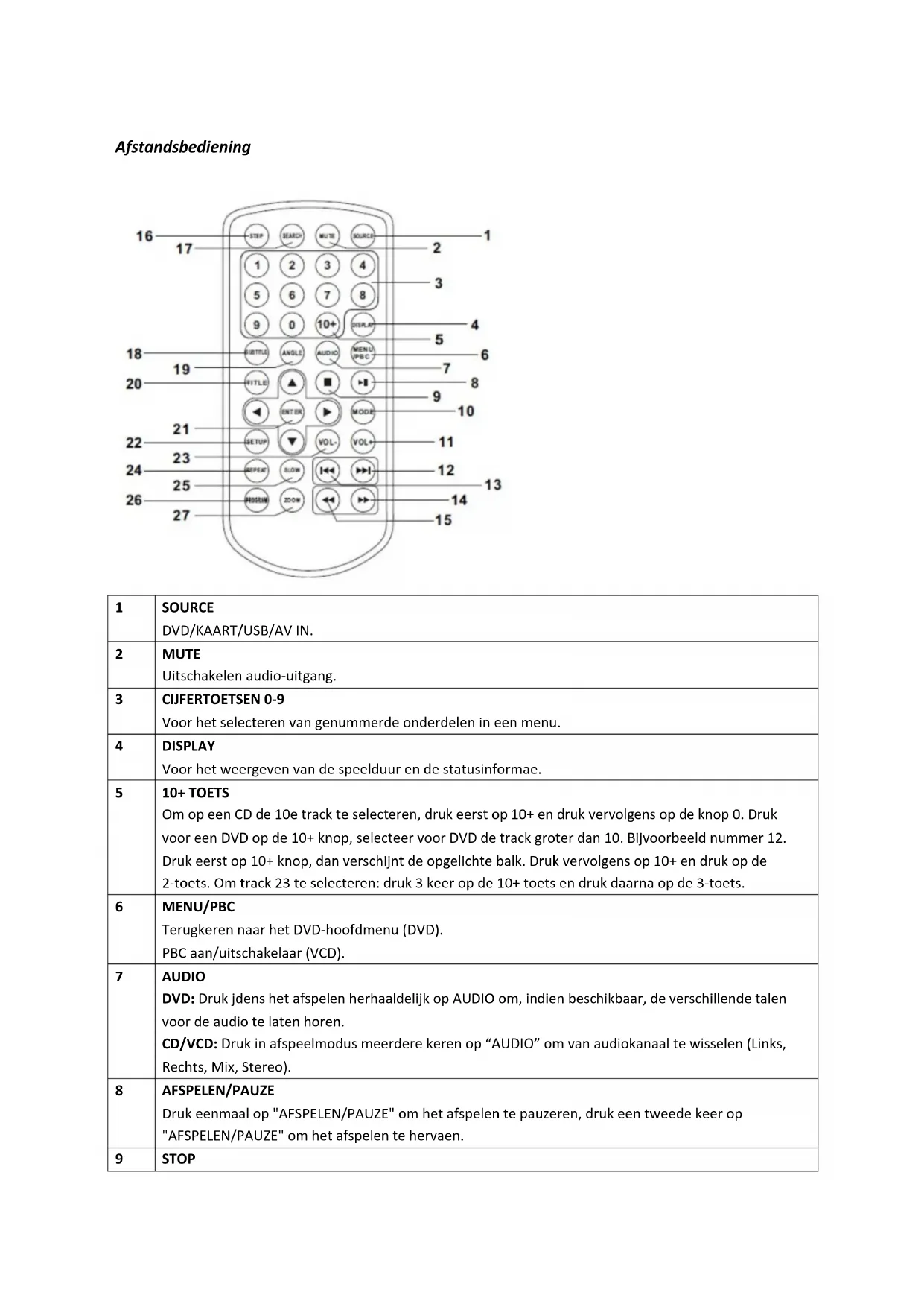 MENU/PBC Terugkeren naar het DVD-hoofdmenu (DVD). PBC aan/uitschakelaar (VCD).